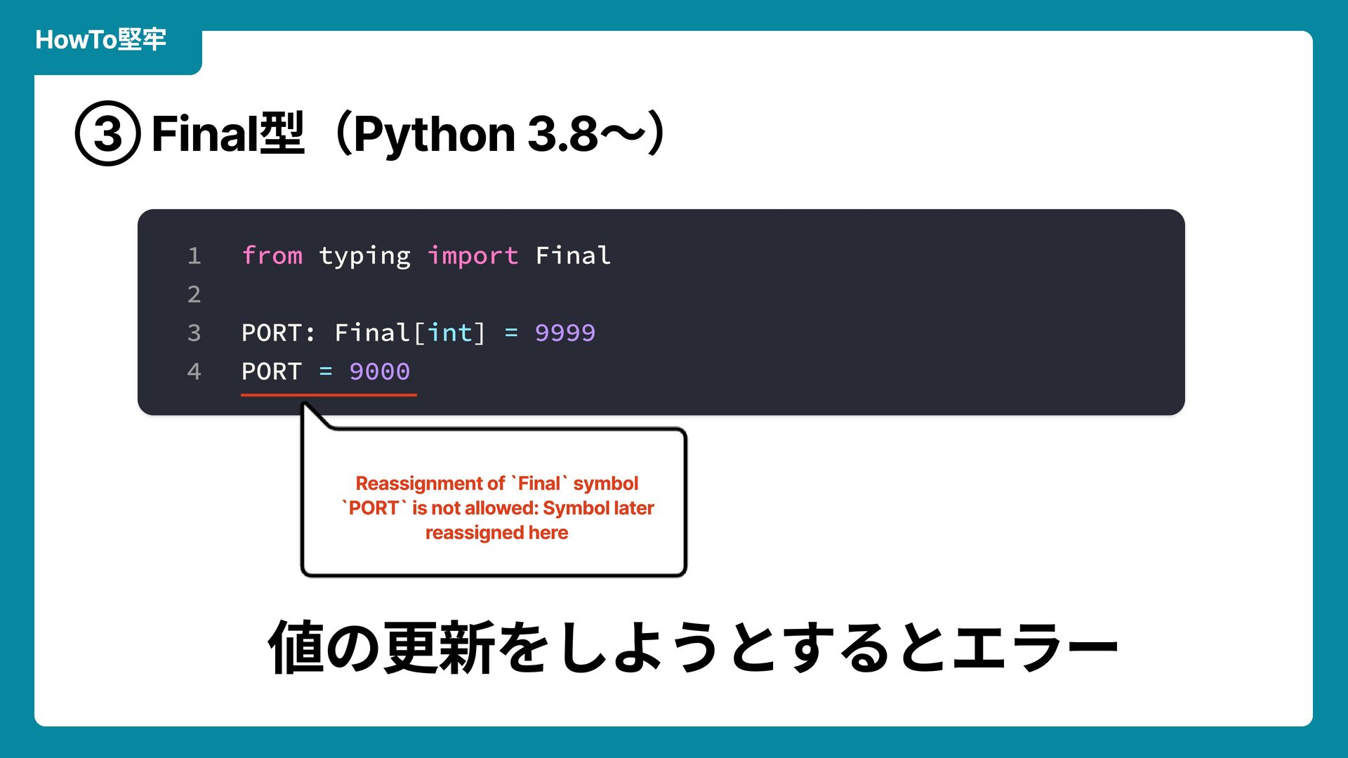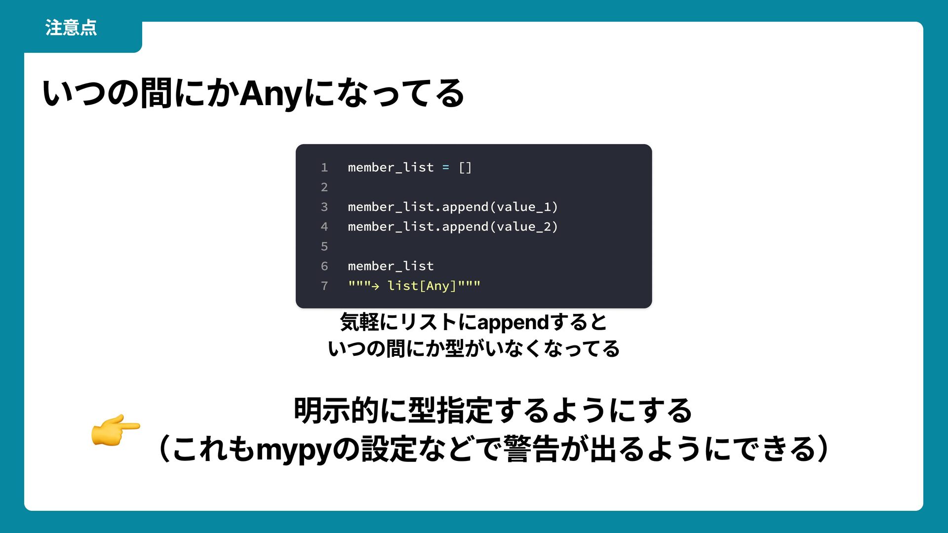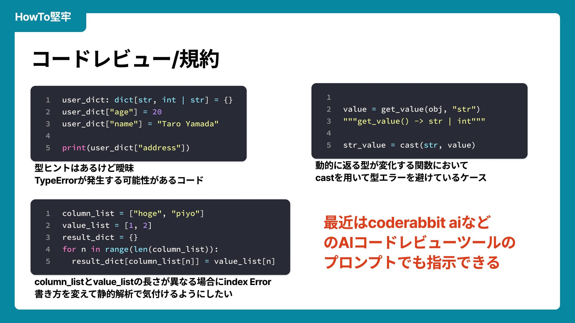 Q i Ö ' T y p e E r r o r L z ˜ Y ‰ ï ý ' L B ‰ ³ ü É Õ — k Ô ‰ ‰ L Y ‰ ¢ p k J D f c a s t ™ ( D f ‰ ¨ é ü ™ Q f D ‰ ± ü ¹ c o l u m n _ l i s t h v a l u e _ l i s t n w U L p j ‰ 4 k i n d e x E r r o r ø M ¹ ™ H f Y — ã ’ g Ø Q ‰ ‹ F k W _ D Ñ o c o d e r a b b i t a i j i n A I ³ ü É ì Ó å ü Ä ü ë n × í ó × È g ‡ : g M ‰ ³üÉìÓåü/‘ 1 2 3 4 5 u s e r _ d i c t : d i c t [ s t r , i n t | s t r ] = { } u s e r _ d i c t [ " a g e " ] = 2 0 u s e r _ d i c t [ " n a m e " ] = " T a r o Y a m a d a " p r i n t ( u s e r _ d i c t [ " a d d r e s s " ] ) 1 2 3 4 5 v a l u e = g e t _ v a l u e ( o b j , " s t r " ) " " " g e t _ v a l u e ( ) - > s t r | i n t " " " s t r _ v a l u e = c a s t ( s t r , v a l u e ) 1 2 3 4 5 c o l u m n _ l i s t = [ " h o g e " , " p i y o " ] v a l u e _ l i s t = [ 1 , 2 ] r e s u l t _ d i c t = { } f o r n i n r a n g e ( l e n ( c o l u m n _ l i s t ) ) : r e s u l t _ d i c t [ c o l u m n _ l i s t [ n ] ] = v a l u e _ l i s t [ n ]