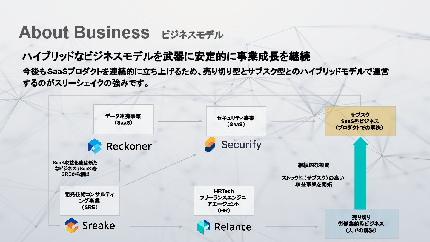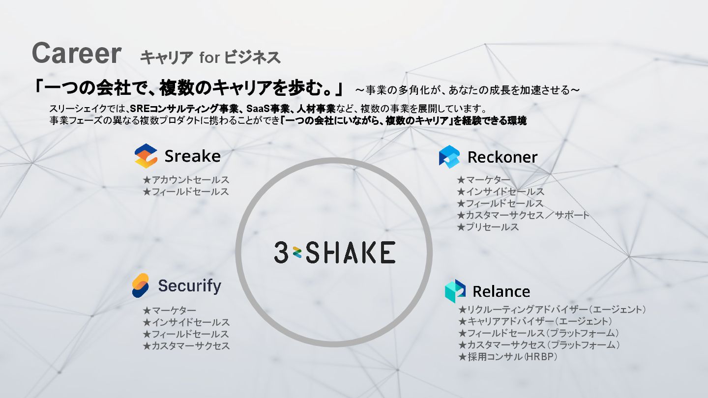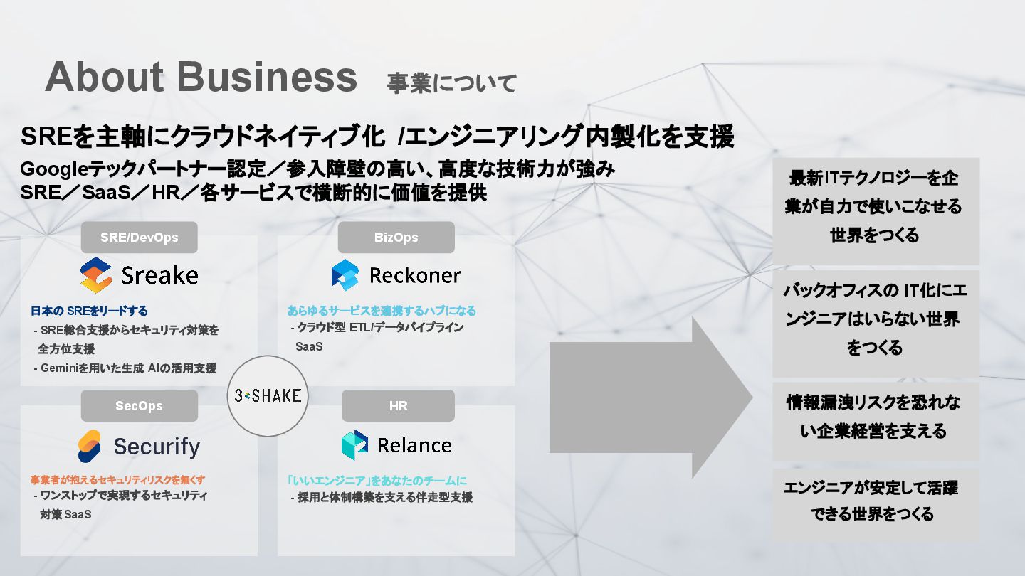 スリーシェイクは、「インフラをシンプルにしてイノベーションが起こりやすい世界を作る」をミッションに、SRE/セキュリティ(SaaS)/データ連携(SaaS)/HRなど複数事業を展開しています。