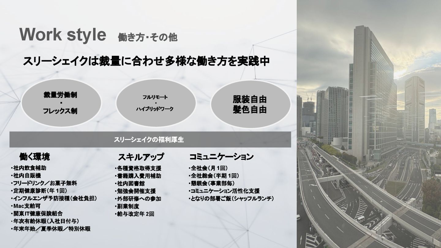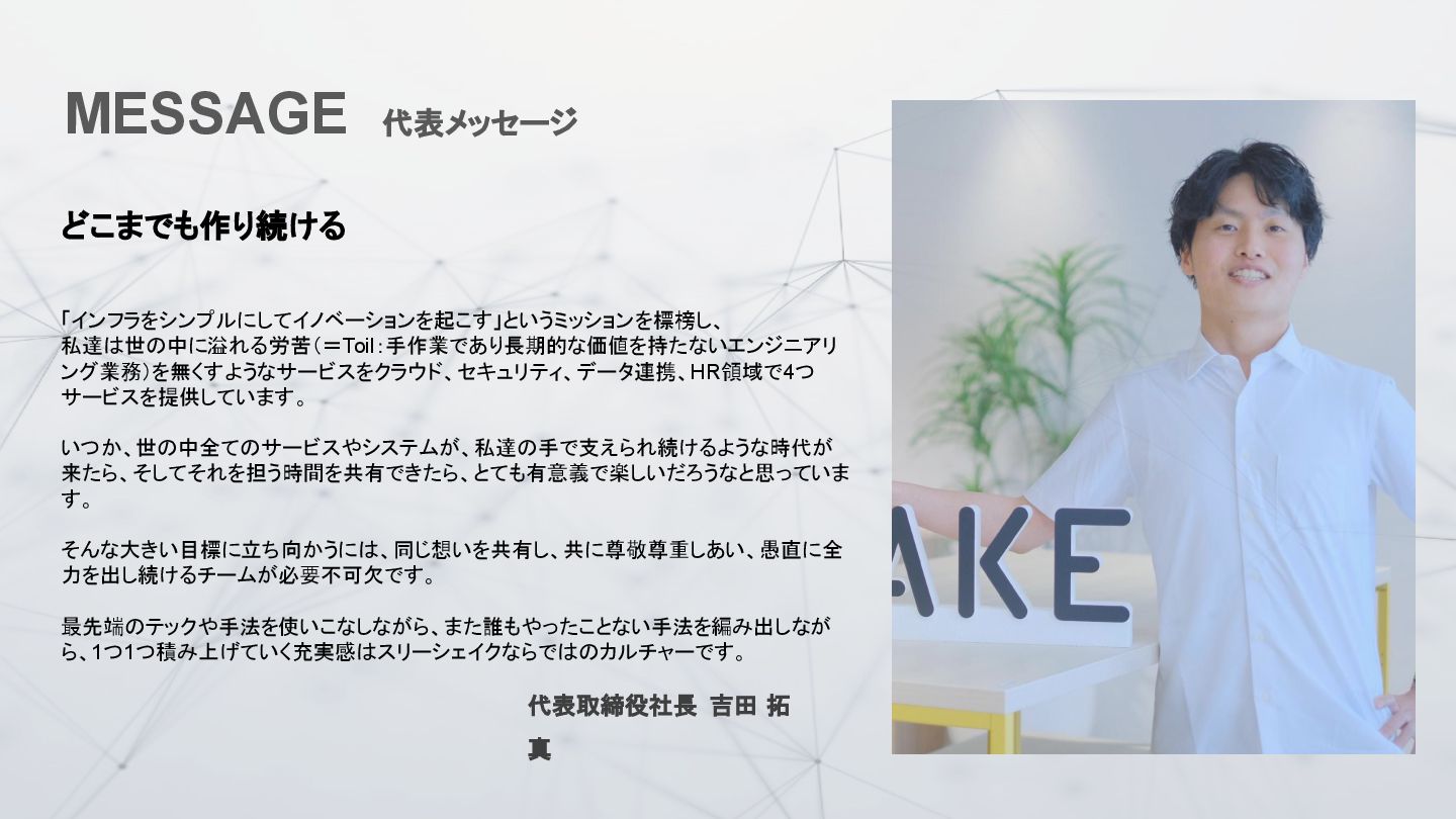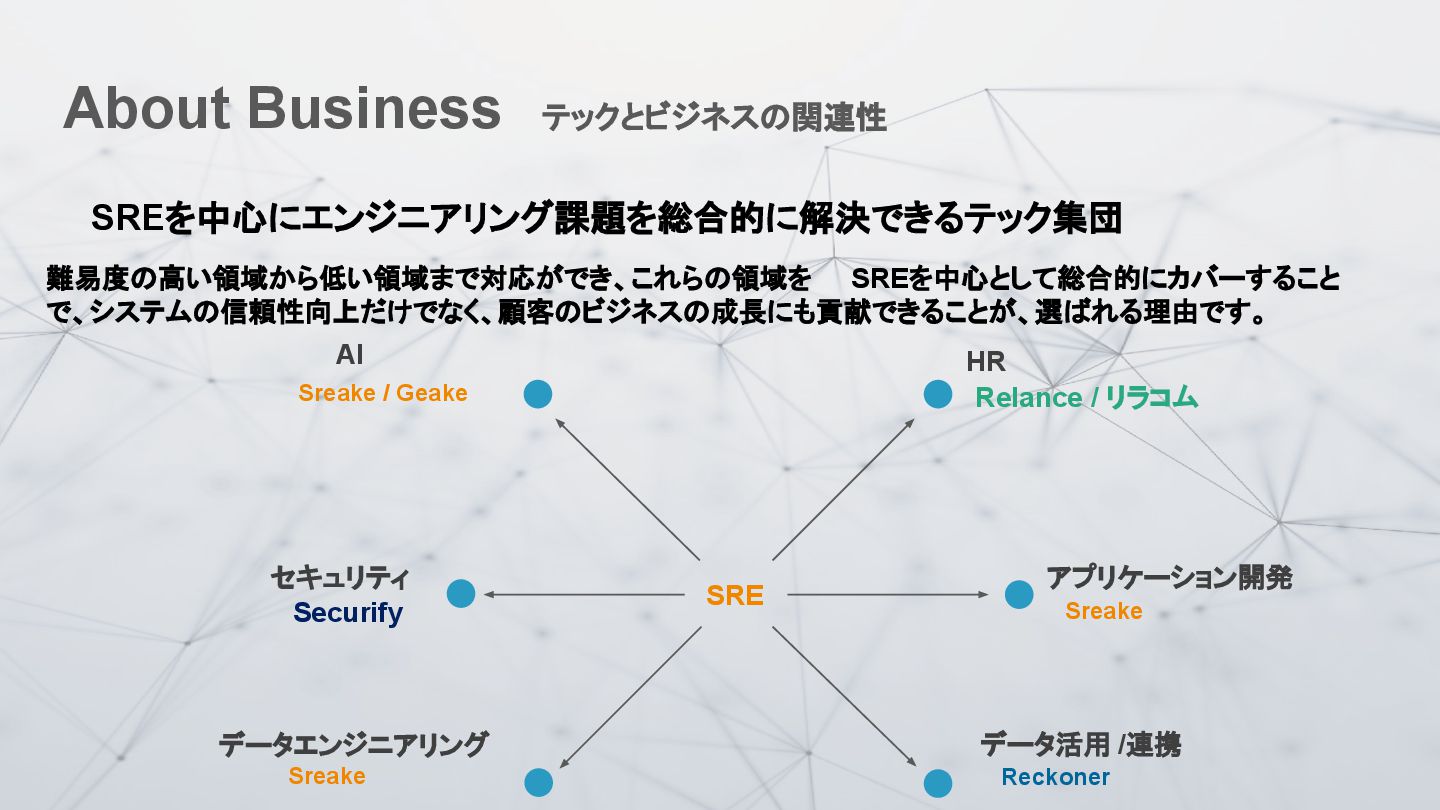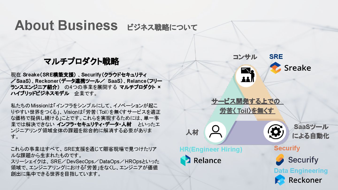 スリーシェイクは、「インフラをシンプルにしてイノベーションが起こりやすい世界を作る」をミッションに、SRE/セキュリティ(SaaS)/データ連携(SaaS)/HRなど複数事業を展開しています。