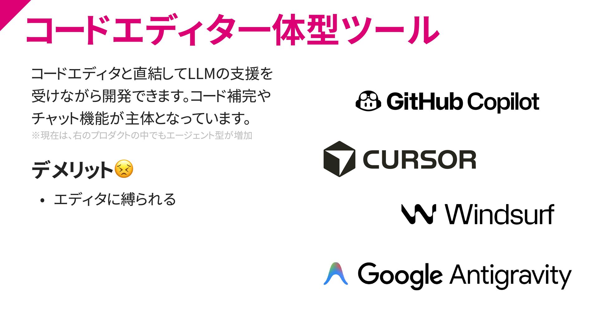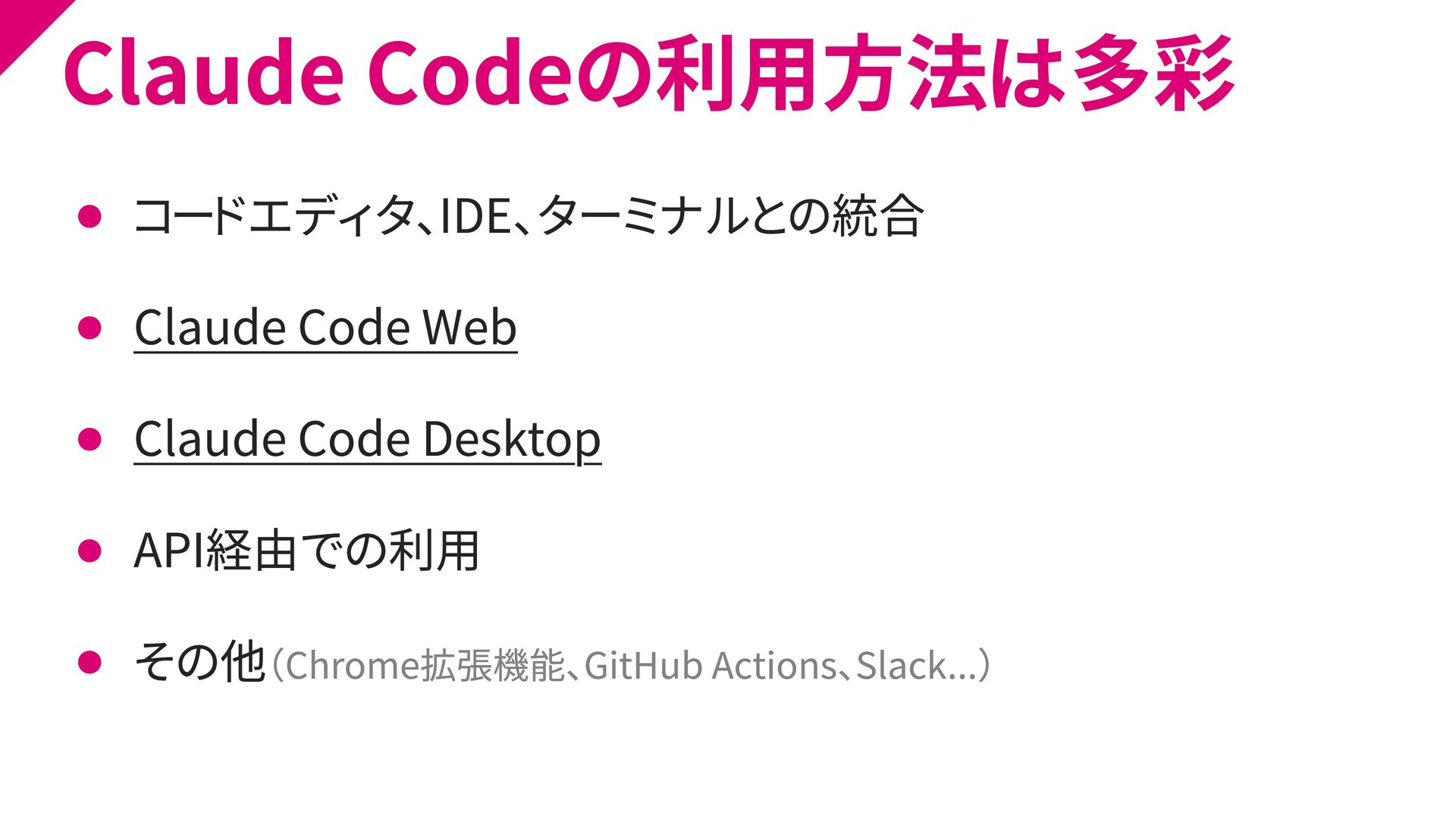 Code Desktop ⚫ API経由での利用 ⚫ その他(Chrome拡張機能、GitHub Actions、Slack...)