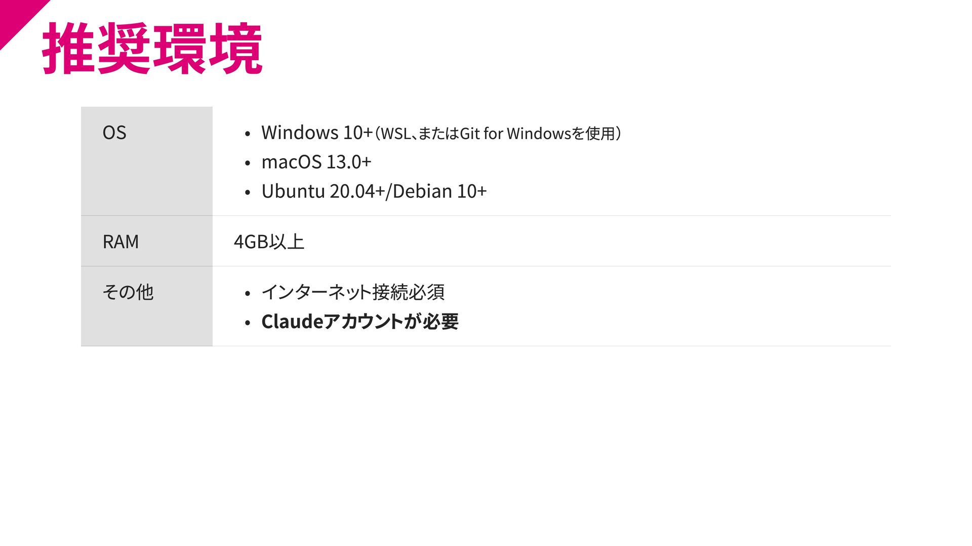 20.04+/Debian 10+ RAM 4GB以上 その他 インターネット接続必須 Claudeアカウントが必要