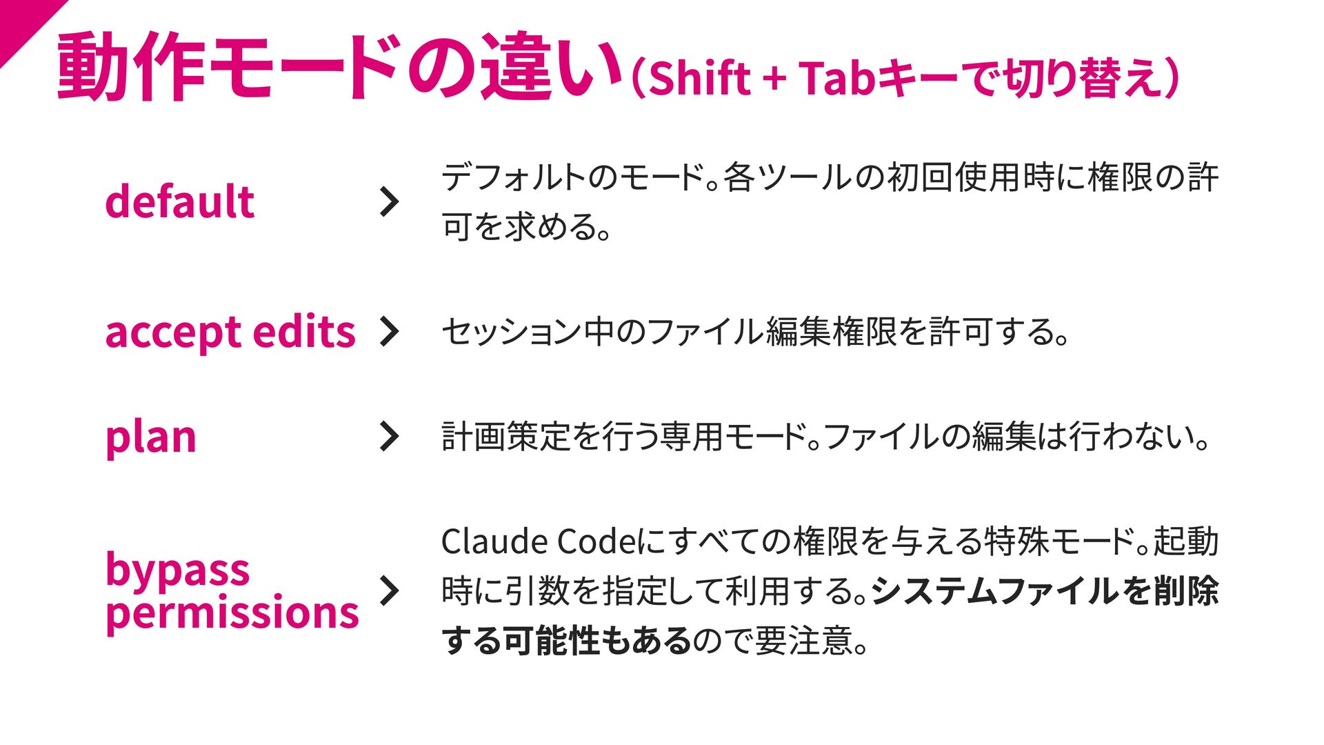 計画策定を行う専用モード。ファイルの編集は行わない。 bypass permissions Claude Codeにすべての権限を与える特殊モード。起動 時に引数を指定して利用する。システムファイルを削除 する可能性もあるので要注意。