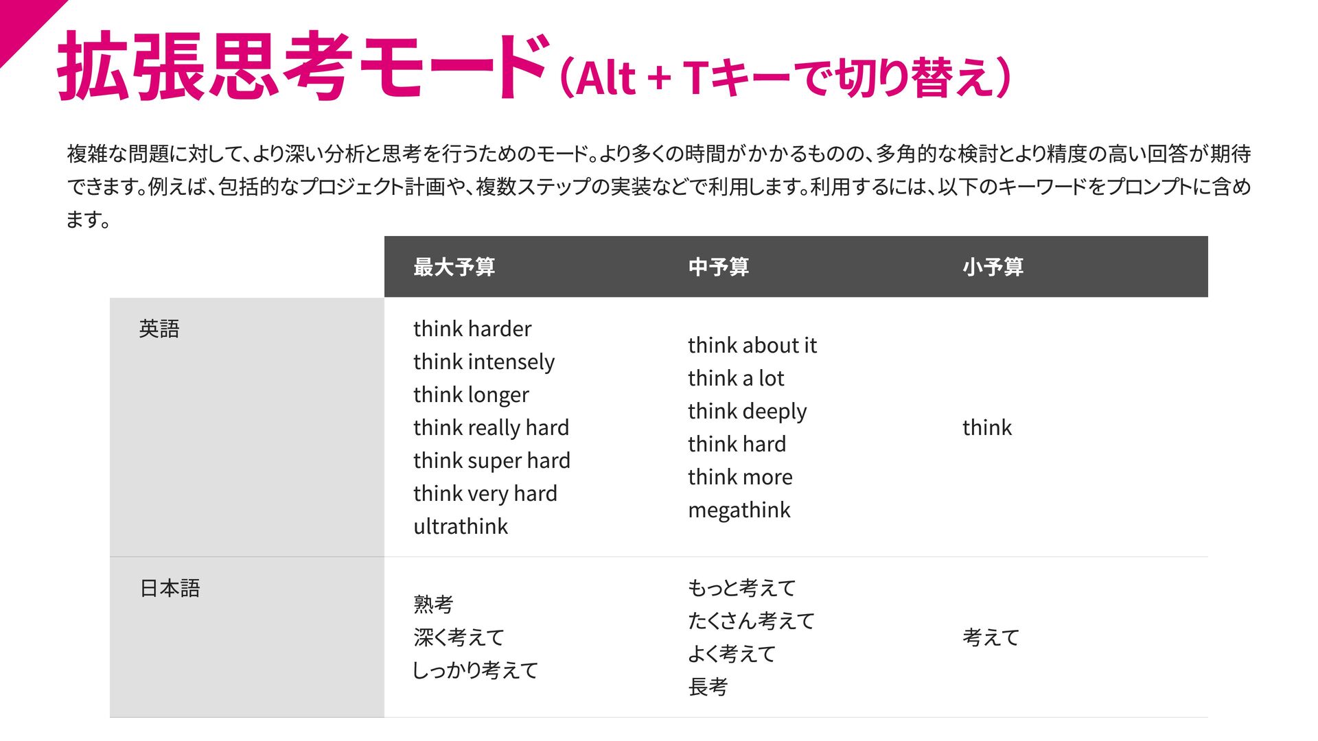 6. 拡張思考モード(Alt + Tキーで切り替え) 最大予算 中予算 小予算 英語 think harder think