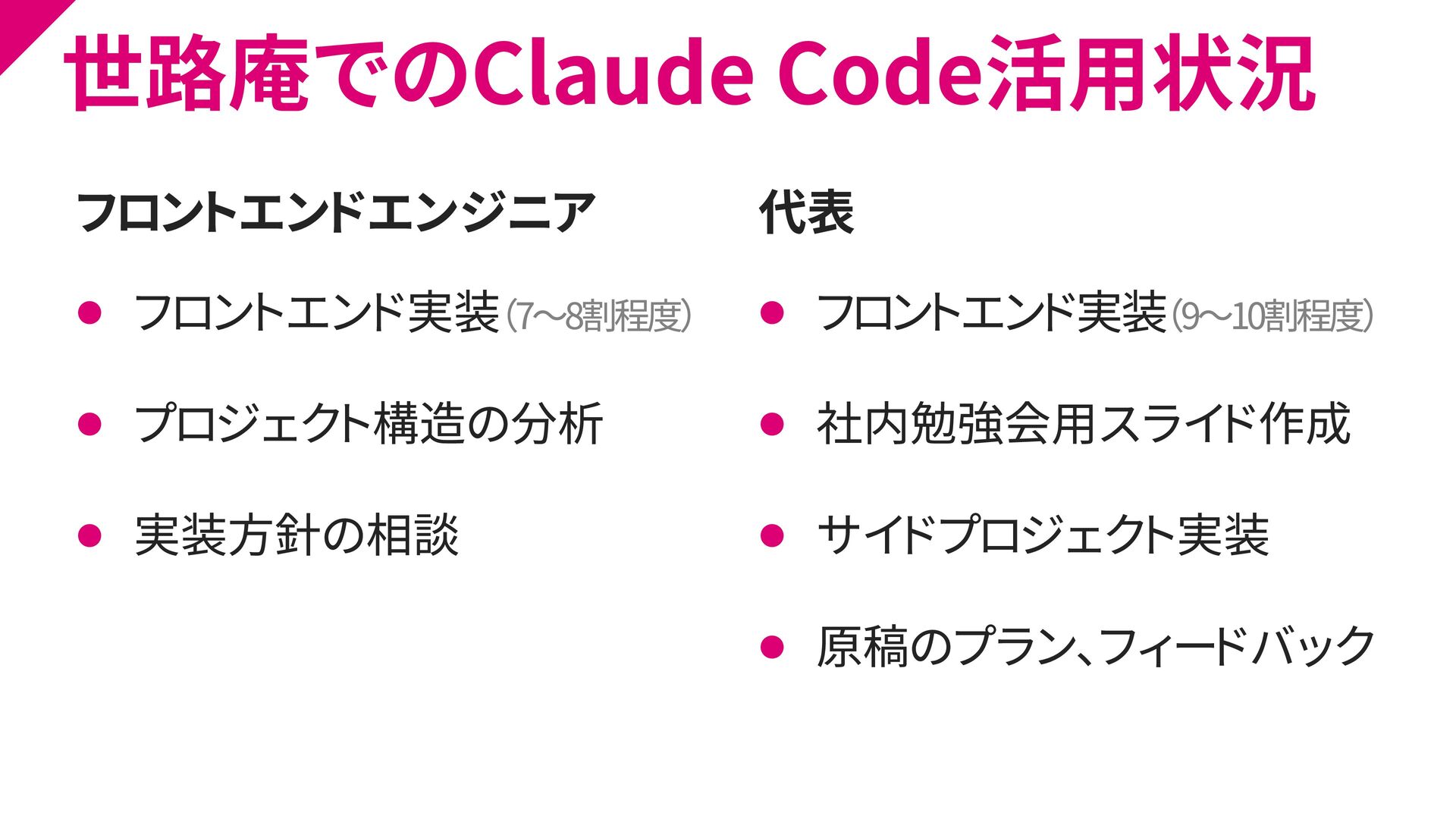 7. 世路庵でのClaude Code活用状況 フロントエンドエンジニア ⚫ フロントエンド実装(7~8割程度) ⚫ プロジェクト構造の分析 ⚫ 実装方針の相談 代表