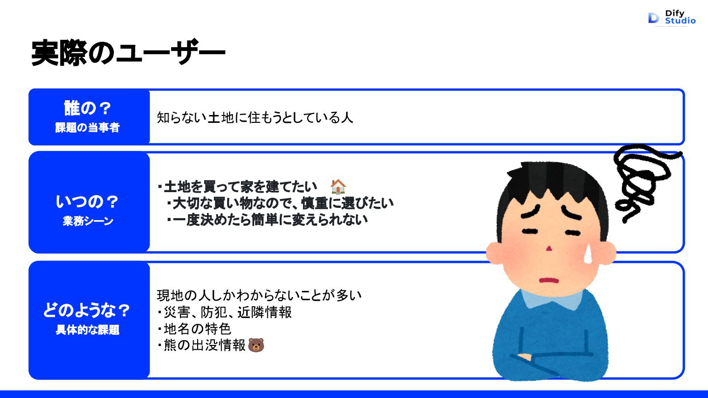 実際のユーザー 誰の? 課題の当事者 知らない土地に住もうとしている人 いつの? 業務シーン ・土地を買って家を建てたい 🏠 ・大切な買い物なので、慎重に選びたい ・一度決めたら簡単に変えられない