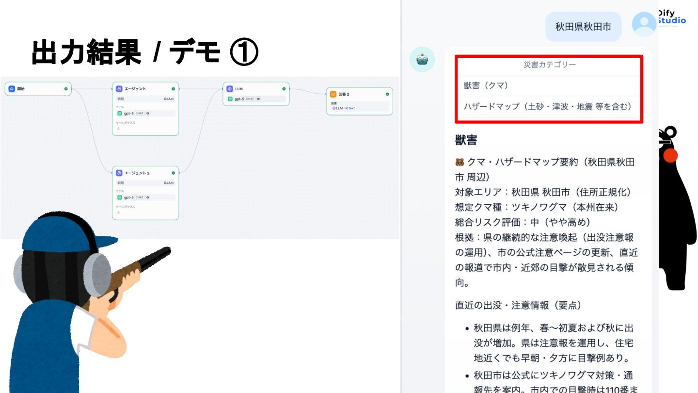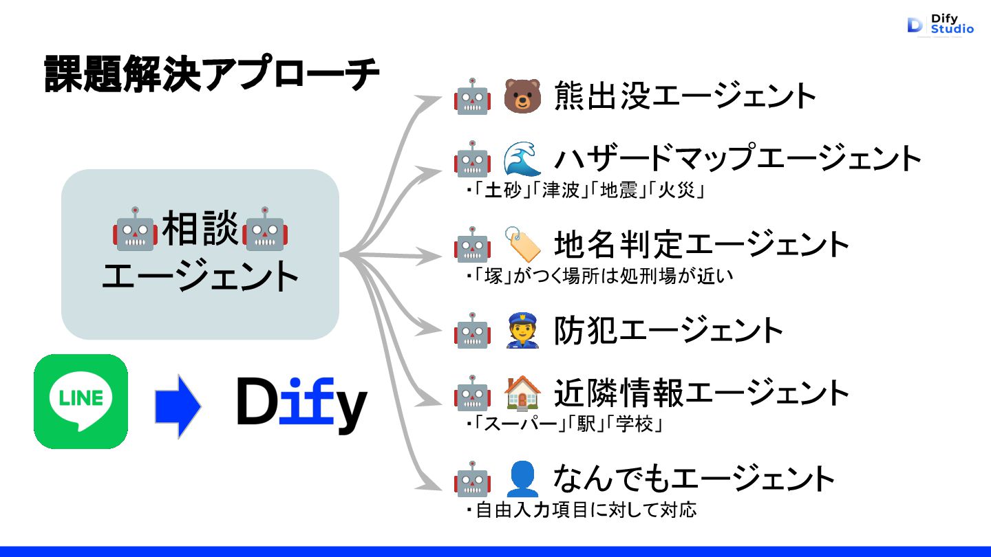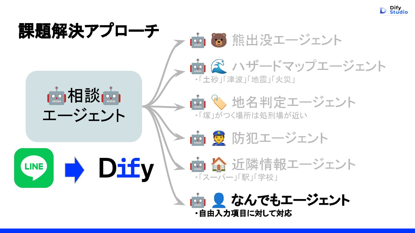 課題解決アプローチ 🤖 🐻 熊出没エージェント 🤖 🌊 ハザードマップエージェント ・「土砂」「津波」「地震」「火災」 🤖 🏷