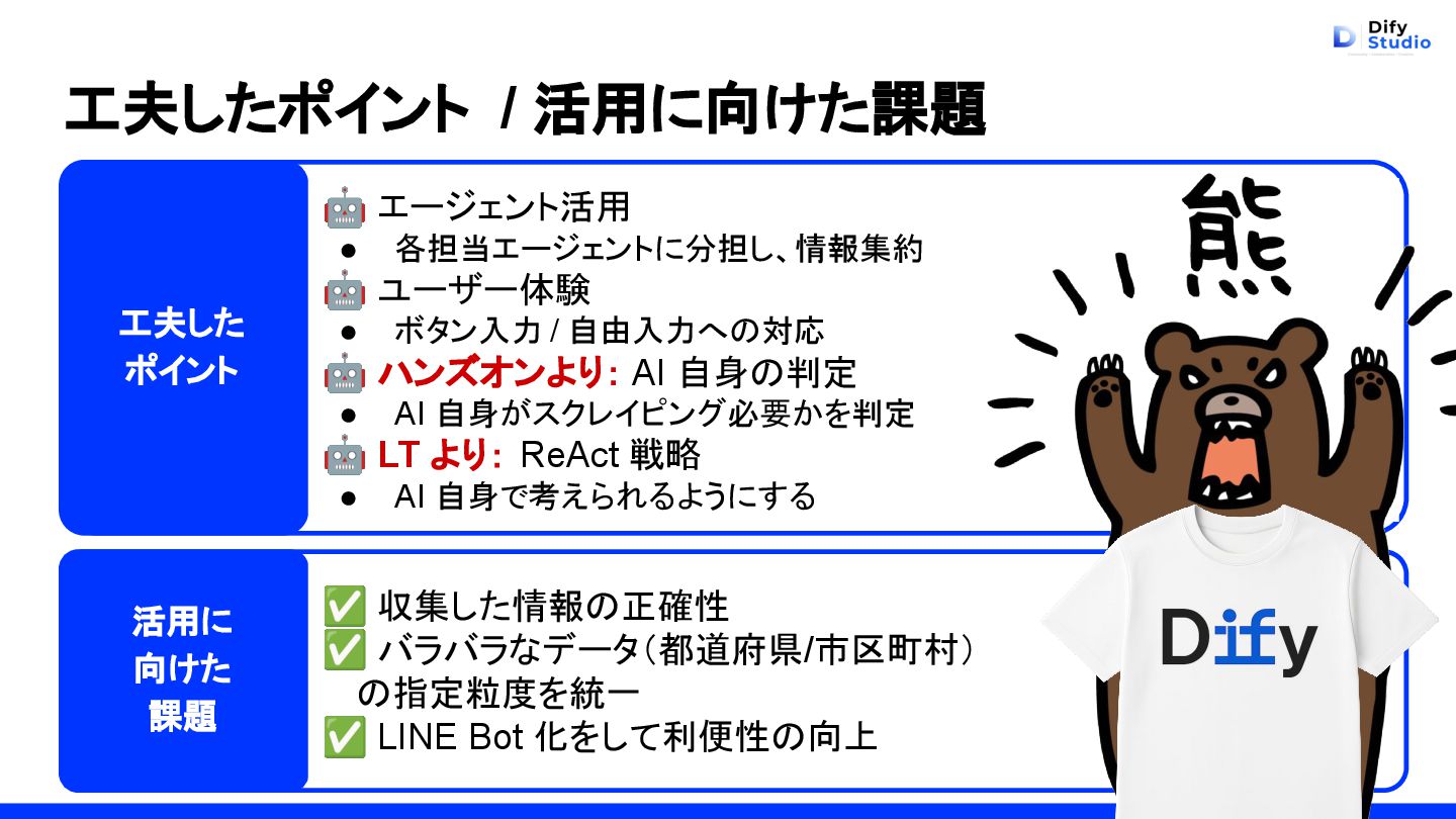 ユーザー体験 • ボタン入力 / 自由入力への対応 🤖 ハンズオンより: AI 自身の判定 • AI 自身がスクレイピング必要かを判定 🤖 LT より: ReAct 戦略 • AI 自身で考えられるようにする 活用に 向けた 課題 ✅ 収集した情報の正確性 ✅ バラバラなデータ(都道府県/市区町村) の指定粒度を統一 ✅ LINE Bot 化をして利便性の向上
