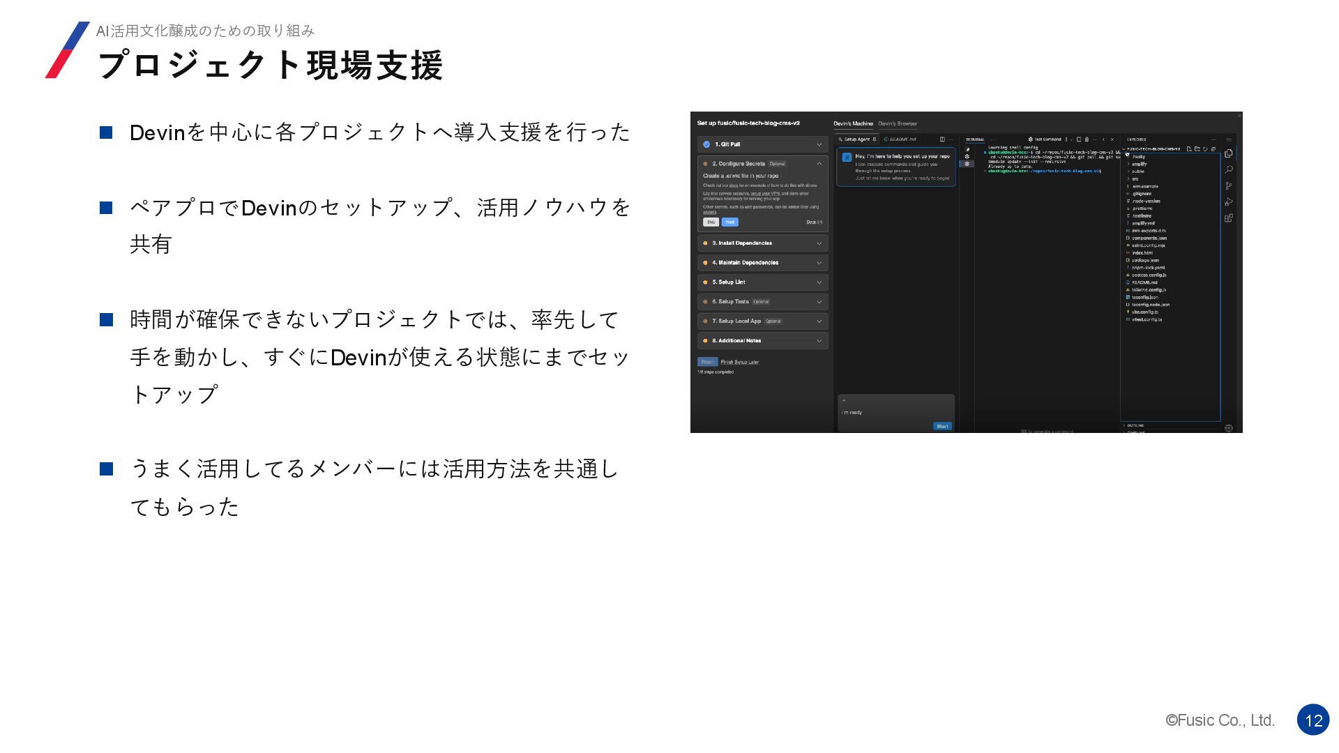 その中で私は、社内勉強会を開催して活用方法を共有したり、各プロジェクトに入り込んでDevinのセットアップを支援したりと、現場に根ざした形でAI導入を推進してきました。