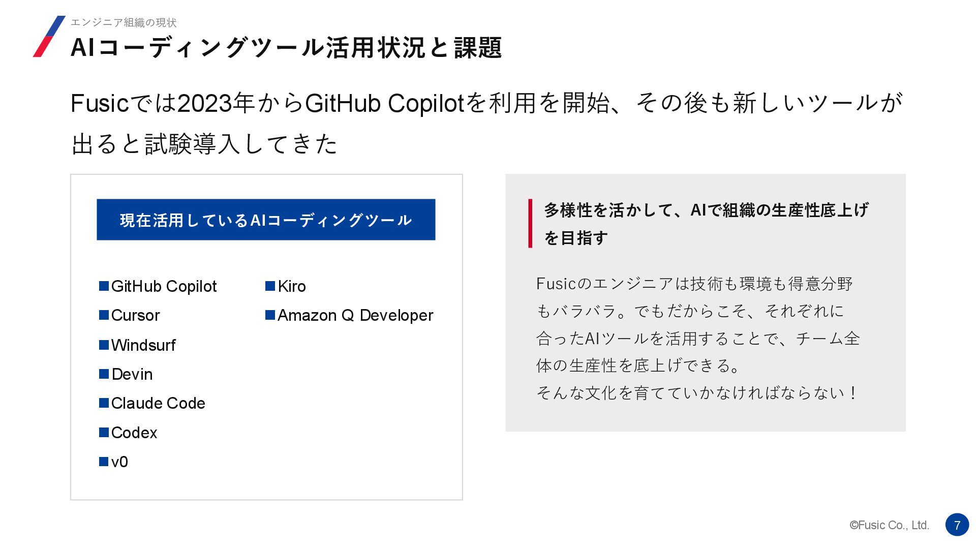 Fusicでは、ChatGPT、GitHub Copilot、Claude Code (Action)、Cursor、v0、Devinなど、さまざまなAIコーディングツールを活用し、開発現場への定着を進めてきました。