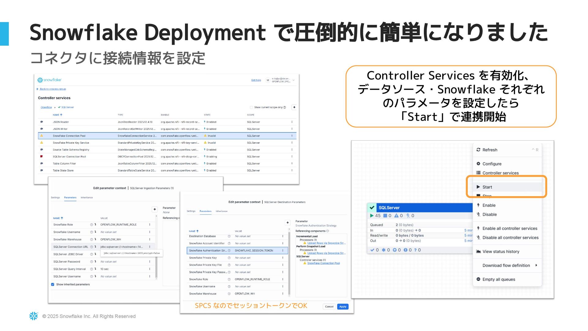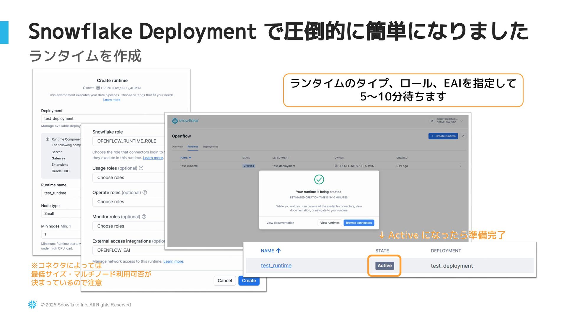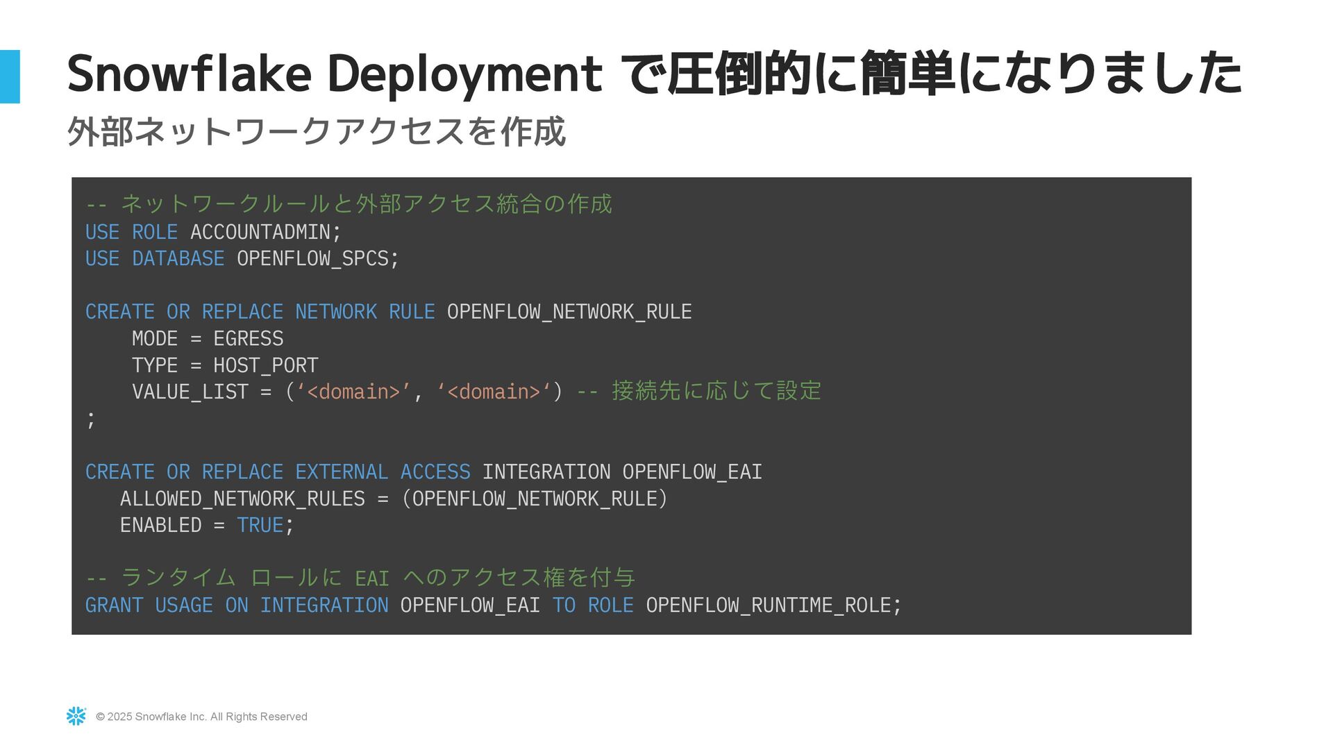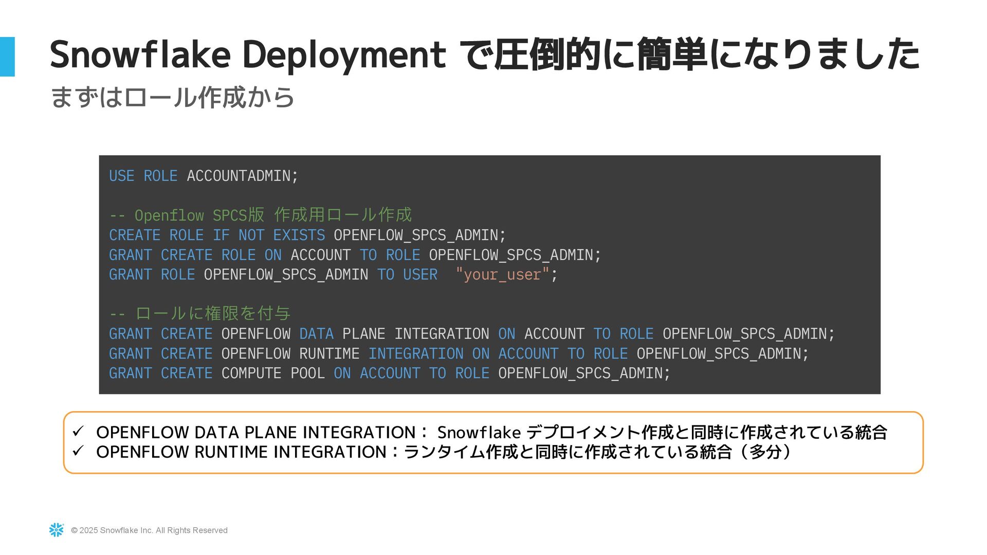 で圧倒的に簡単になりました USE ROLE ACCOUNTADMIN; -- Openflow SPCS版 作成用ロール作成 CREATE ROLE IF NOT EXISTS OPENFLOW_SPCS_ADMIN; GRANT CREATE ROLE ON ACCOUNT TO ROLE OPENFLOW_SPCS_ADMIN; GRANT ROLE OPENFLOW_SPCS_ADMIN TO USER "your_user"; -- ロールに権限を付与 GRANT CREATE OPENFLOW DATA PLANE INTEGRATION ON ACCOUNT TO ROLE OPENFLOW_SPCS_ADMIN; GRANT CREATE OPENFLOW RUNTIME INTEGRATION ON ACCOUNT TO ROLE OPENFLOW_SPCS_ADMIN; GRANT CREATE COMPUTE POOL ON ACCOUNT TO ROLE OPENFLOW_SPCS_ADMIN; ✓ OPENFLOW DATA PLANE INTEGRATION: Snowflake デプロイメント作成と同時に作成されている統合 ✓ OPENFLOW RUNTIME INTEGRATION:ランタイム作成と同時に作成されている統合(多分)