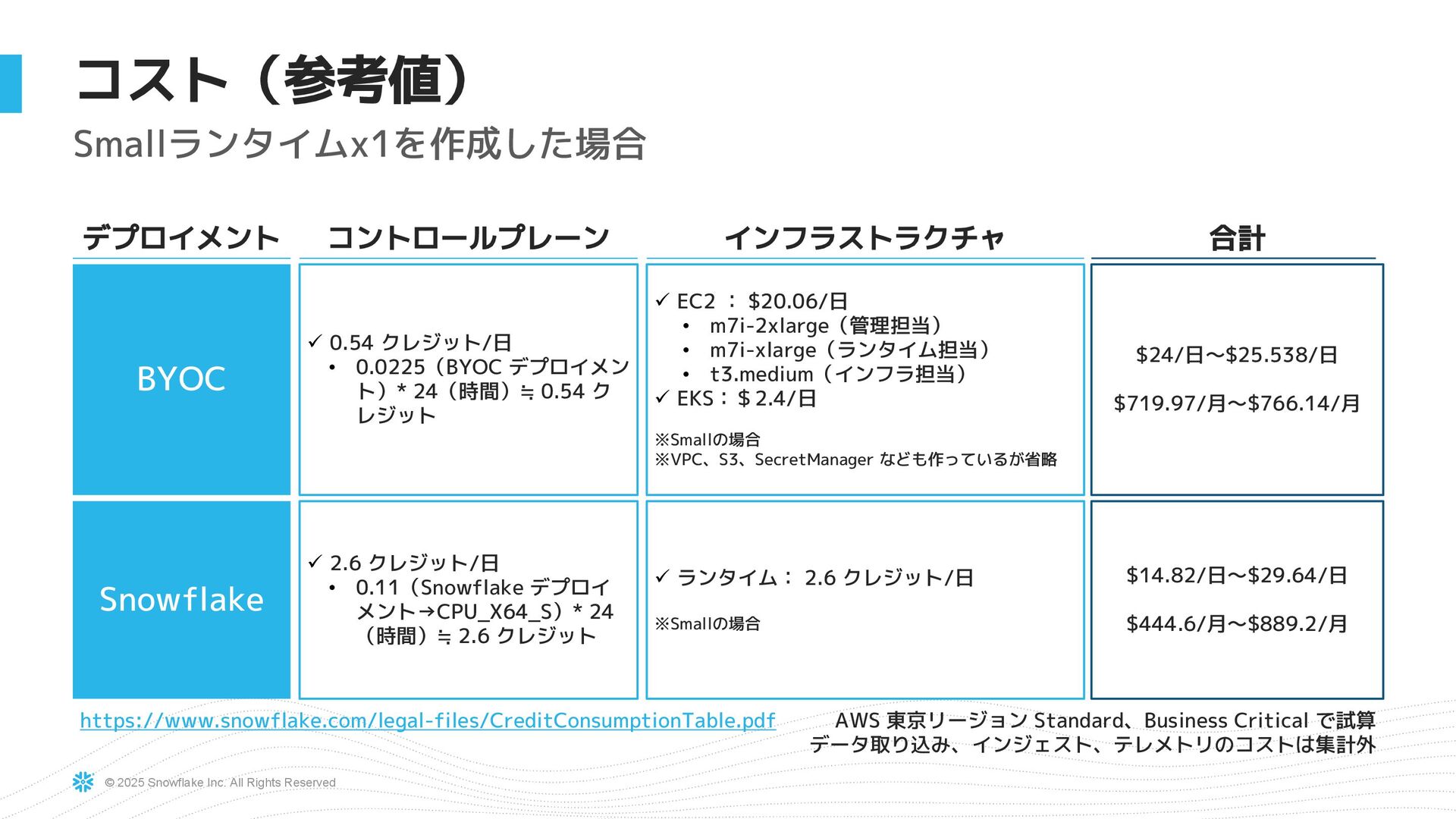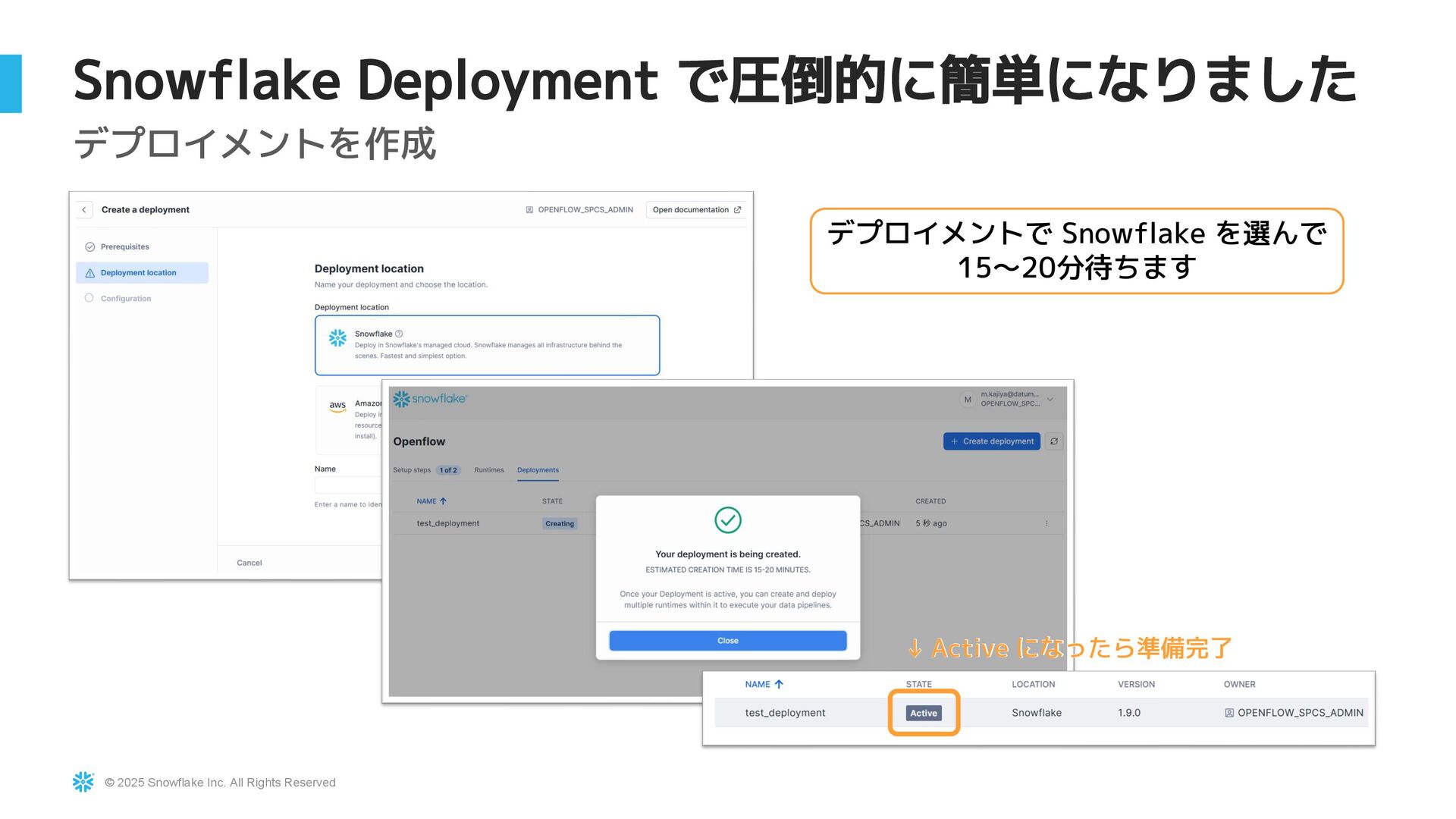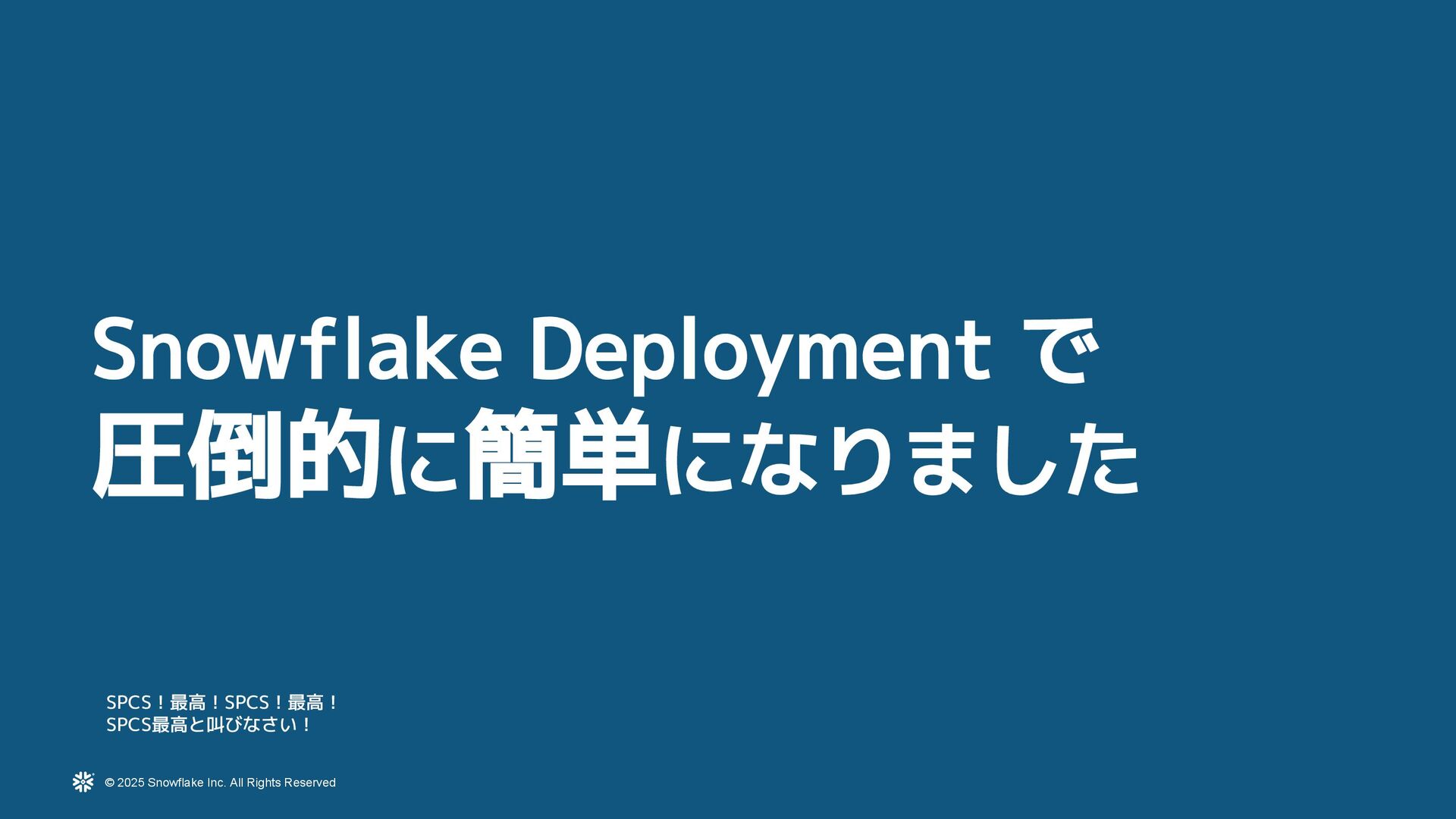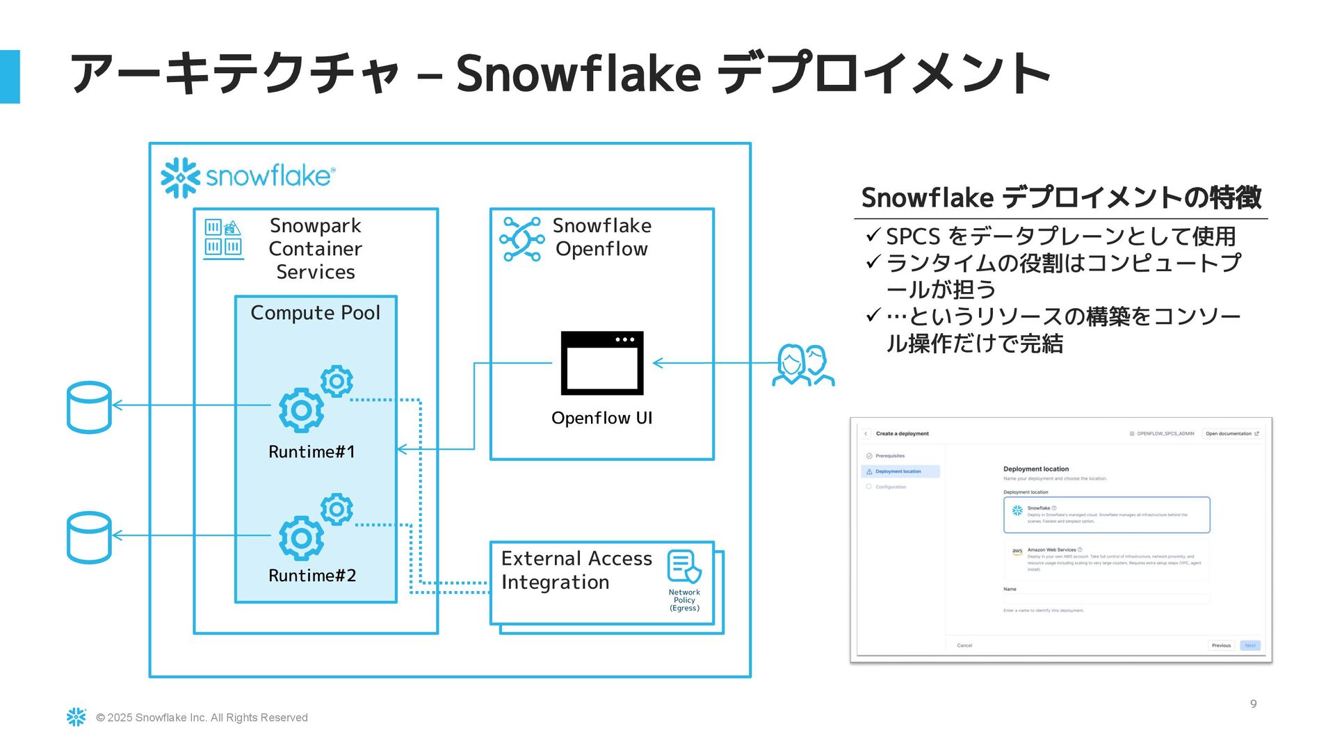 で圧倒的に簡単になりました USE ROLE ACCOUNTADMIN; -- Openflow SPCS版 作成用ロール作成 CREATE ROLE IF NOT EXISTS OPENFLOW_SPCS_ADMIN; GRANT CREATE ROLE ON ACCOUNT TO ROLE OPENFLOW_SPCS_ADMIN; GRANT ROLE OPENFLOW_SPCS_ADMIN TO USER "your_user"; -- ロールに権限を付与 GRANT CREATE OPENFLOW DATA PLANE INTEGRATION ON ACCOUNT TO ROLE OPENFLOW_SPCS_ADMIN; GRANT CREATE OPENFLOW RUNTIME INTEGRATION ON ACCOUNT TO ROLE OPENFLOW_SPCS_ADMIN; GRANT CREATE COMPUTE POOL ON ACCOUNT TO ROLE OPENFLOW_SPCS_ADMIN; ✓ OPENFLOW DATA PLANE INTEGRATION: Snowflake デプロイメント作成と同時に作成されている統合 ✓ OPENFLOW RUNTIME INTEGRATION:ランタイム作成と同時に作成されている統合(多分)
