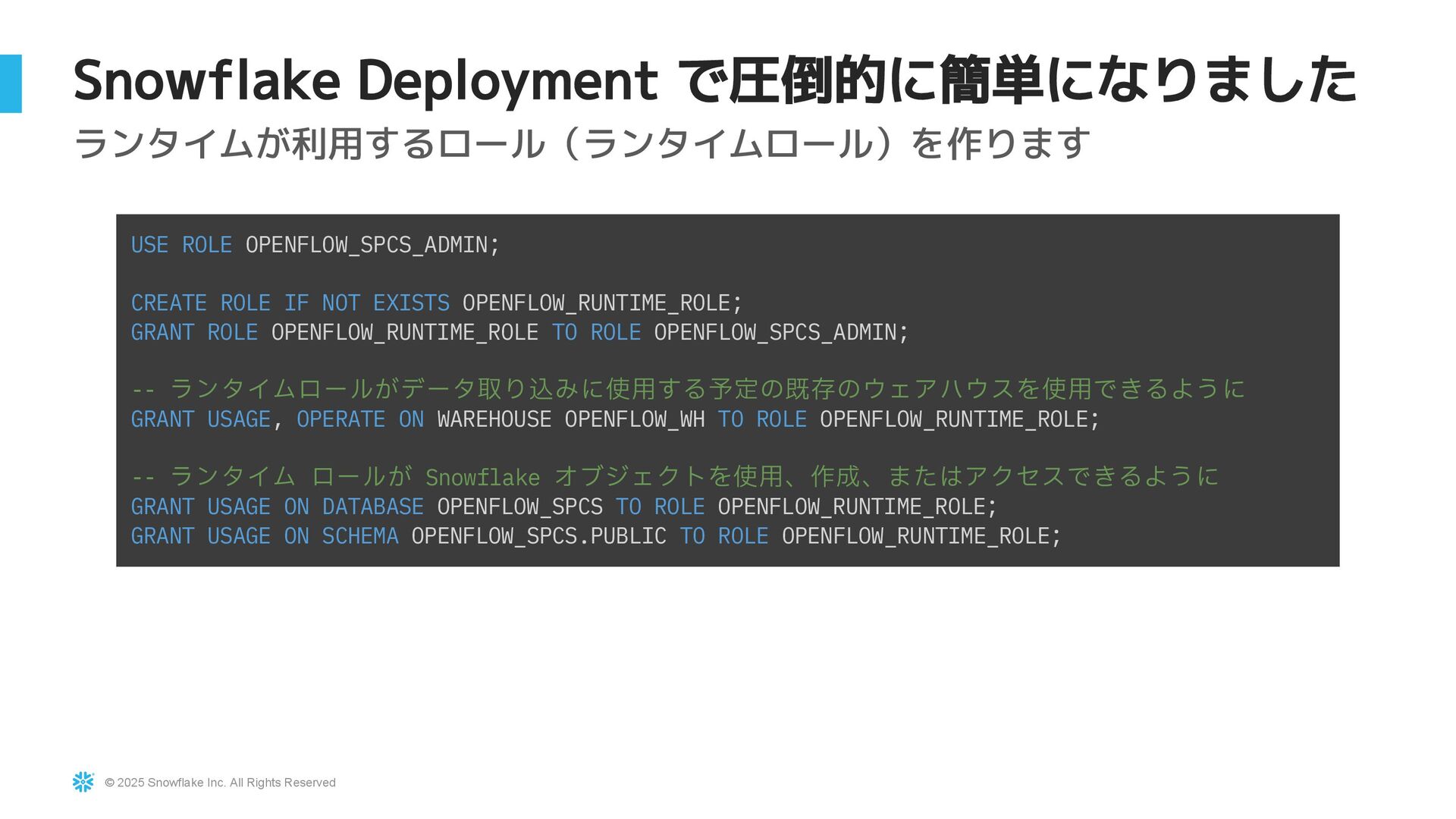で圧倒的に簡単になりました USE ROLE OPENFLOW_SPCS_ADMIN; CREATE ROLE IF NOT EXISTS OPENFLOW_RUNTIME_ROLE; GRANT ROLE OPENFLOW_RUNTIME_ROLE TO ROLE OPENFLOW_SPCS_ADMIN; -- ランタイムロールがデータ取り込みに使用する予定の既存のウェアハウスを使用できるように GRANT USAGE, OPERATE ON WAREHOUSE OPENFLOW_WH TO ROLE OPENFLOW_RUNTIME_ROLE; -- ランタイム ロールが Snowflake オブジェクトを使用、作成、またはアクセスできるように GRANT USAGE ON DATABASE OPENFLOW_SPCS TO ROLE OPENFLOW_RUNTIME_ROLE; GRANT USAGE ON SCHEMA OPENFLOW_SPCS.PUBLIC TO ROLE OPENFLOW_RUNTIME_ROLE;