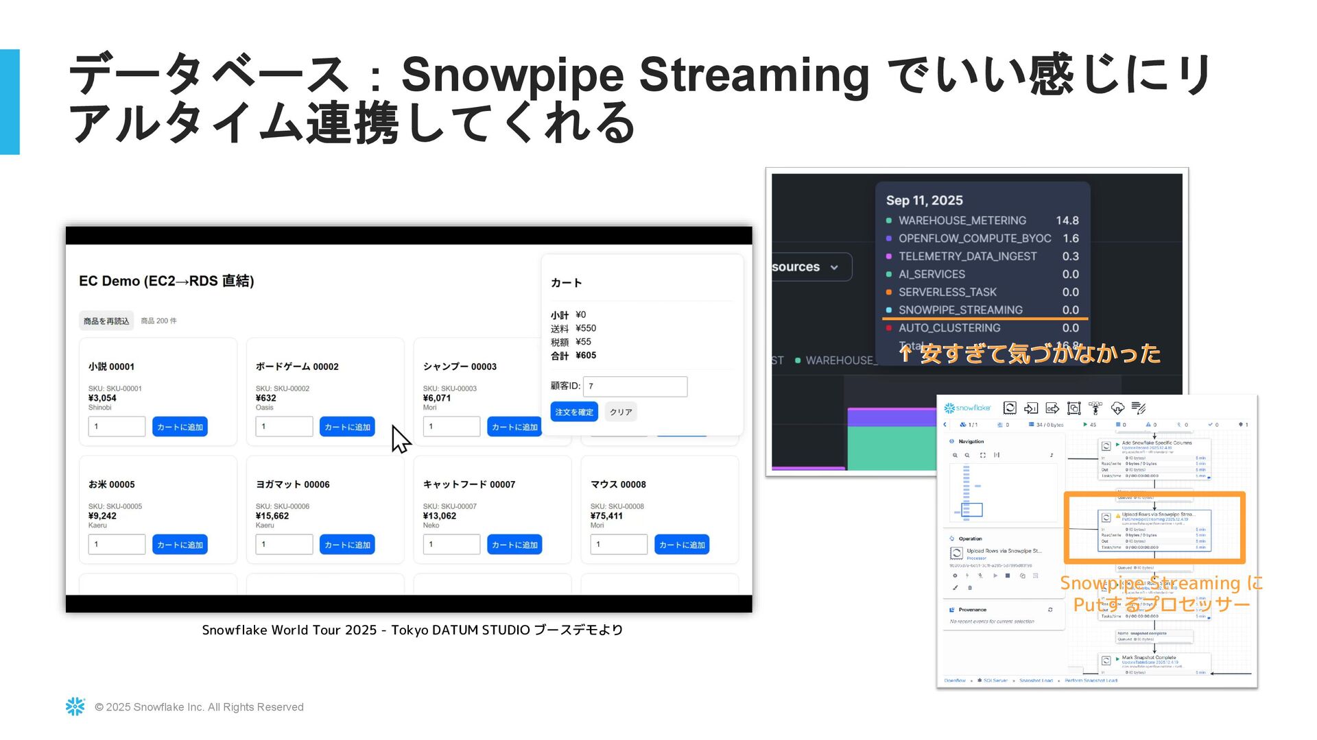 アルタイム連携してくれる Snowflake World Tour 2025 - Tokyo DATUM STUDIO ブースデモより ↑ 安すぎて気づかなかった ↑ 安すぎて気づかなかった Snowpipe Streaming に Putするプロセッサー Snowpipe Streaming に Putするプロセッサー
