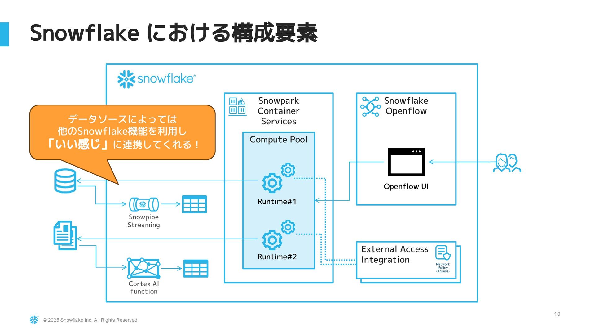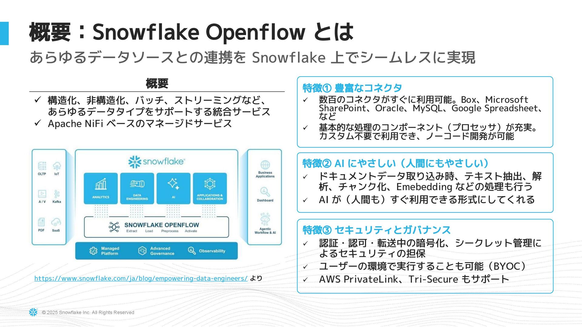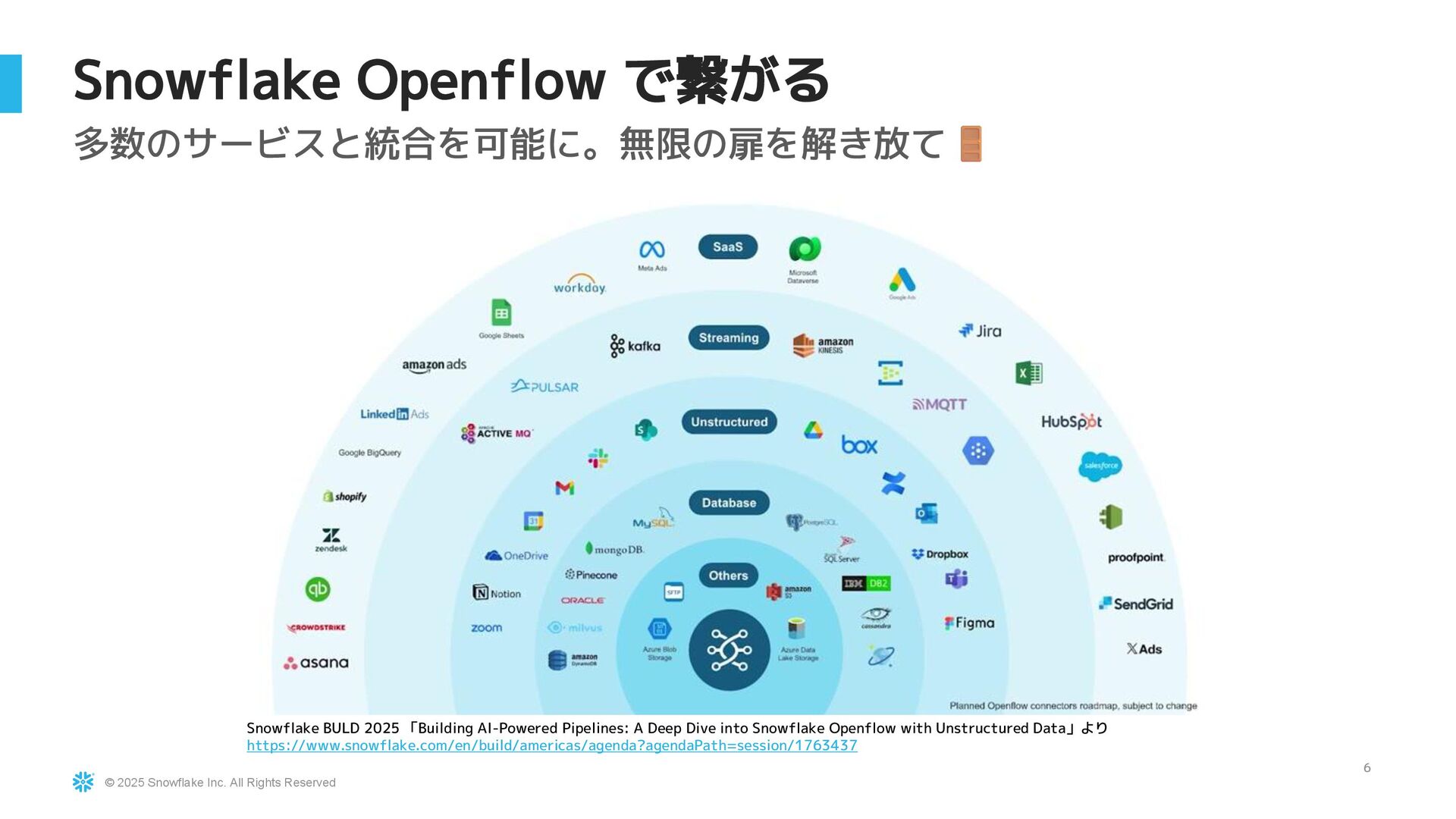 Openflow で繋がる Snowflake BULD 2025 「Building AI-Powered Pipelines: A Deep Dive into Snowflake Openflow with Unstructured Data」より https://www.snowflake.com/en/build/americas/agenda?agendaPath=session/1763437