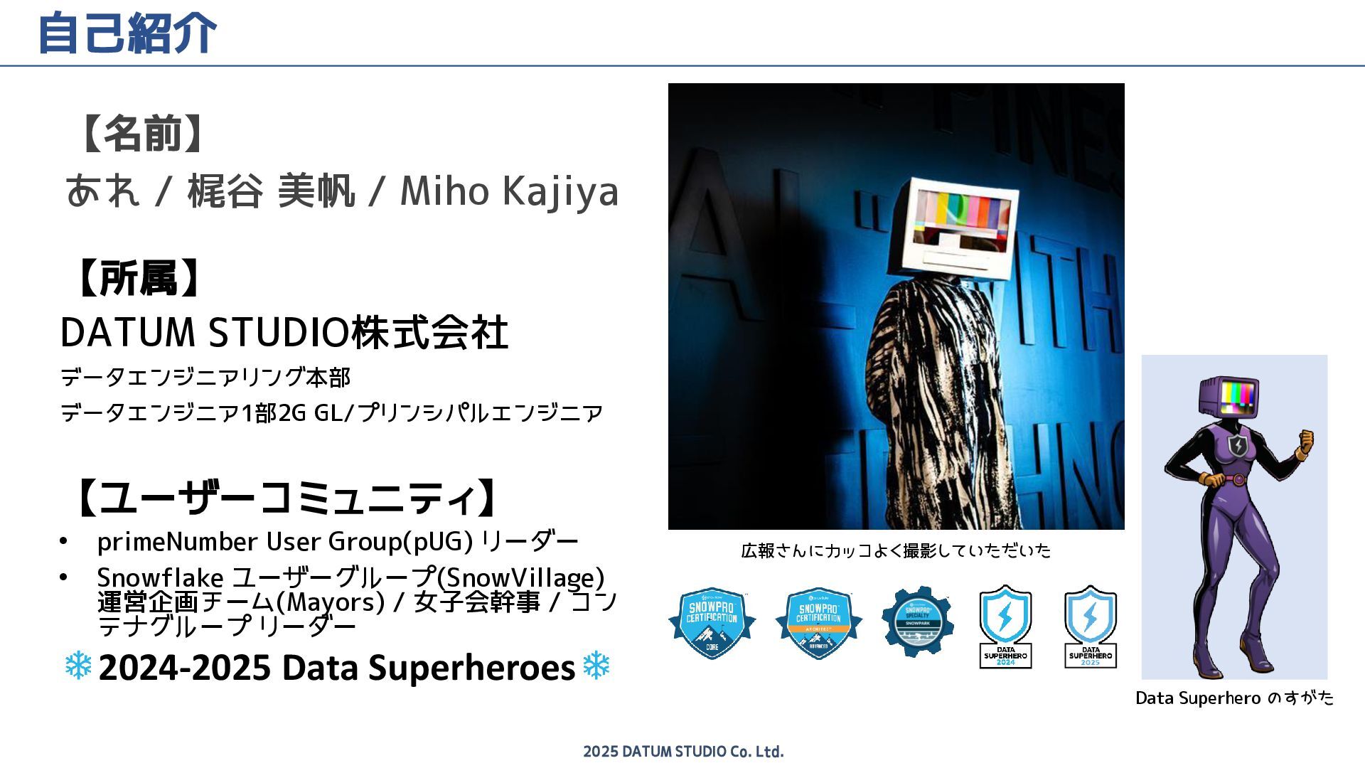 データエンジニアリング本部 データエンジニア1部2G GL/プリンシパルエンジニア 【ユーザーコミュニティ】 • primeNumber User Group(pUG) リーダー • Snowflake ユーザーグループ(SnowVillage) 運営企画チーム(Mayors) / 女子会幹事 / コン テナグループ リーダー 2024-2025 Data Superheroes Data Superhero のすがた 【名前】 あれ / 梶谷 美帆 / Miho Kajiya