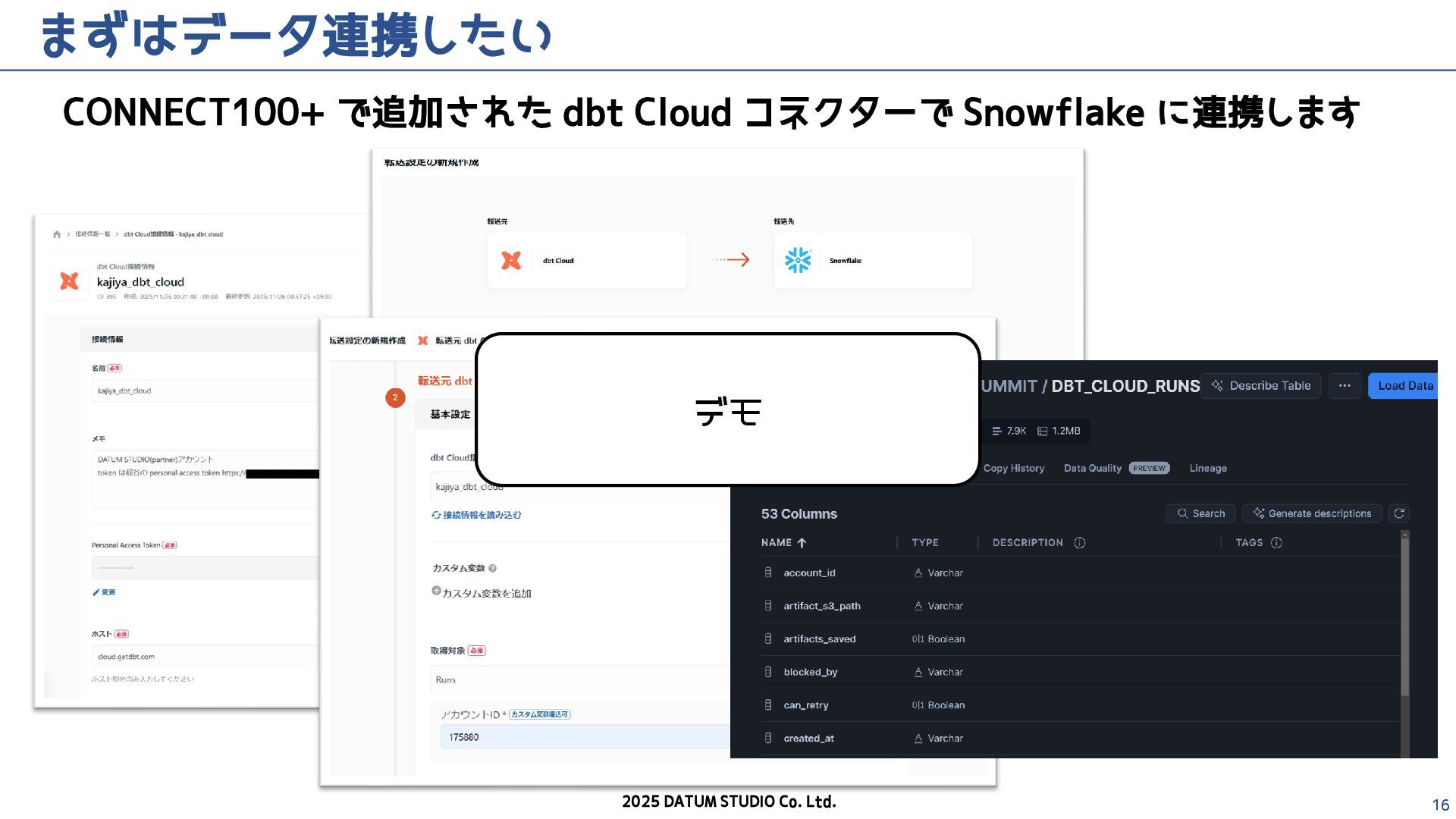 2025 DATUM STUDIO Co. Ltd. 16 まずはデータ連携したい CONNECT100+ で追加された dbt