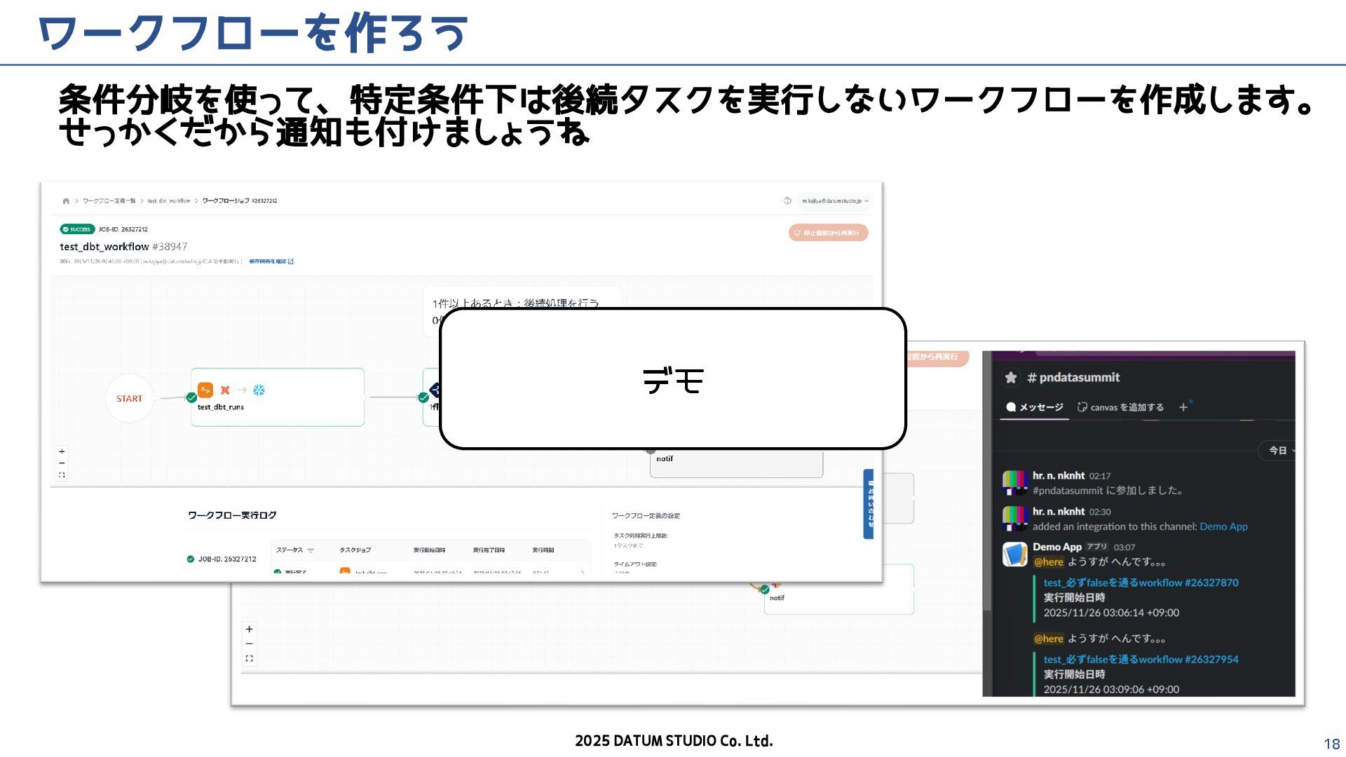 2025 DATUM STUDIO Co. Ltd. 18 ワークフローを作ろう 条件分岐を使って、特定条件下は後続タスクを実行しないワークフローを作成します。 せっかくだから通知も付けましょうね デモ