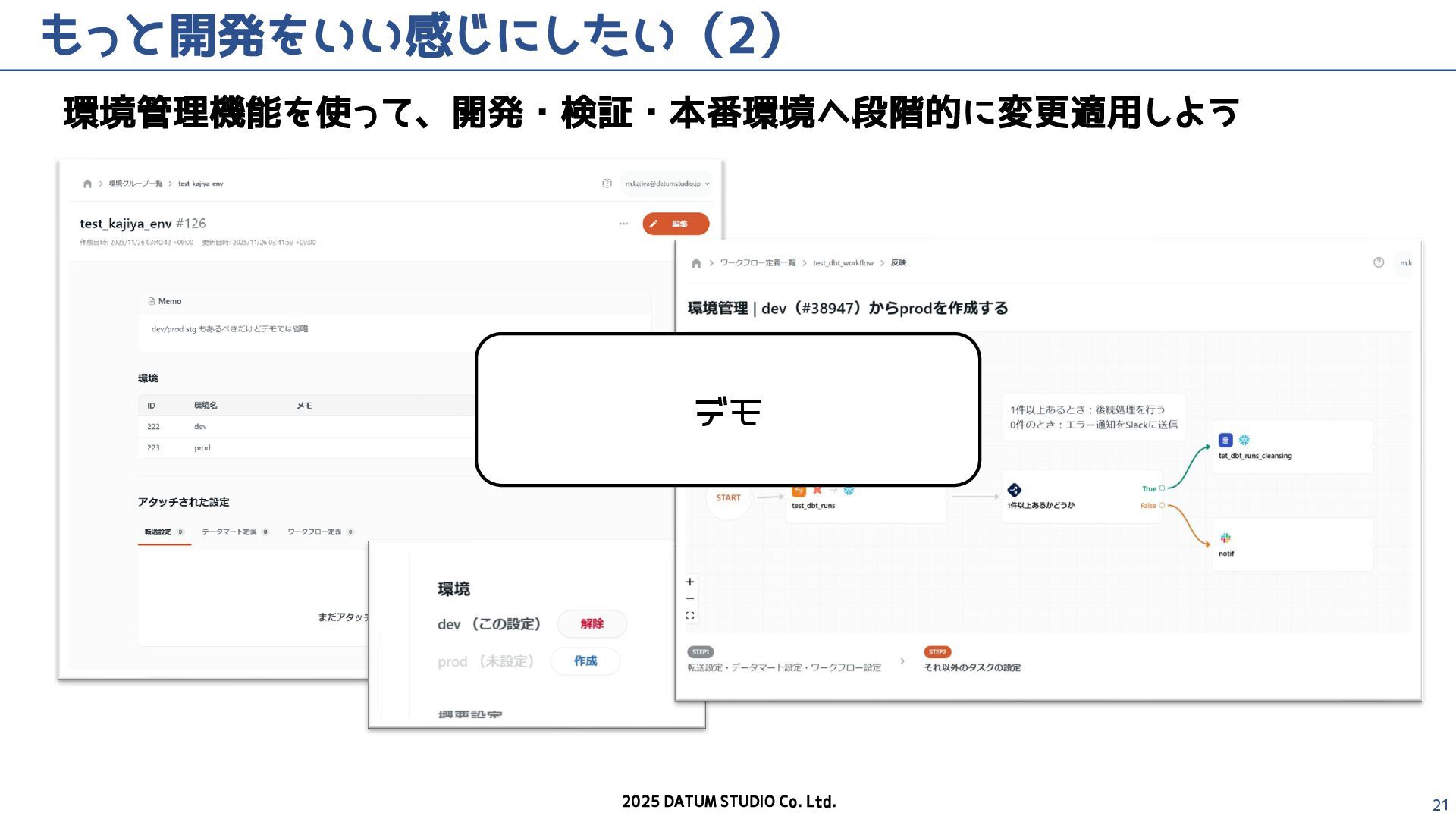 2025 DATUM STUDIO Co. Ltd. 21 もっと開発をいい感じにしたい(2) 環境管理機能を使って、開発・検証・本番環境へ段階的に変更適用しよう デモ