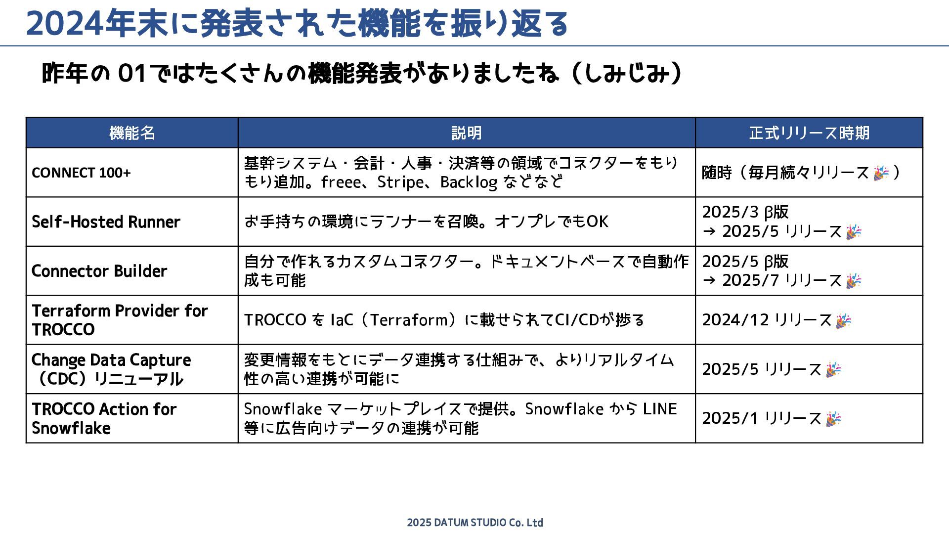 2025 DATUM STUDIO Co. Ltd. 2024年 01(zeroONE)で発表された TROCCO の新機能たちでした (開発チームの皆さまありがとう!)