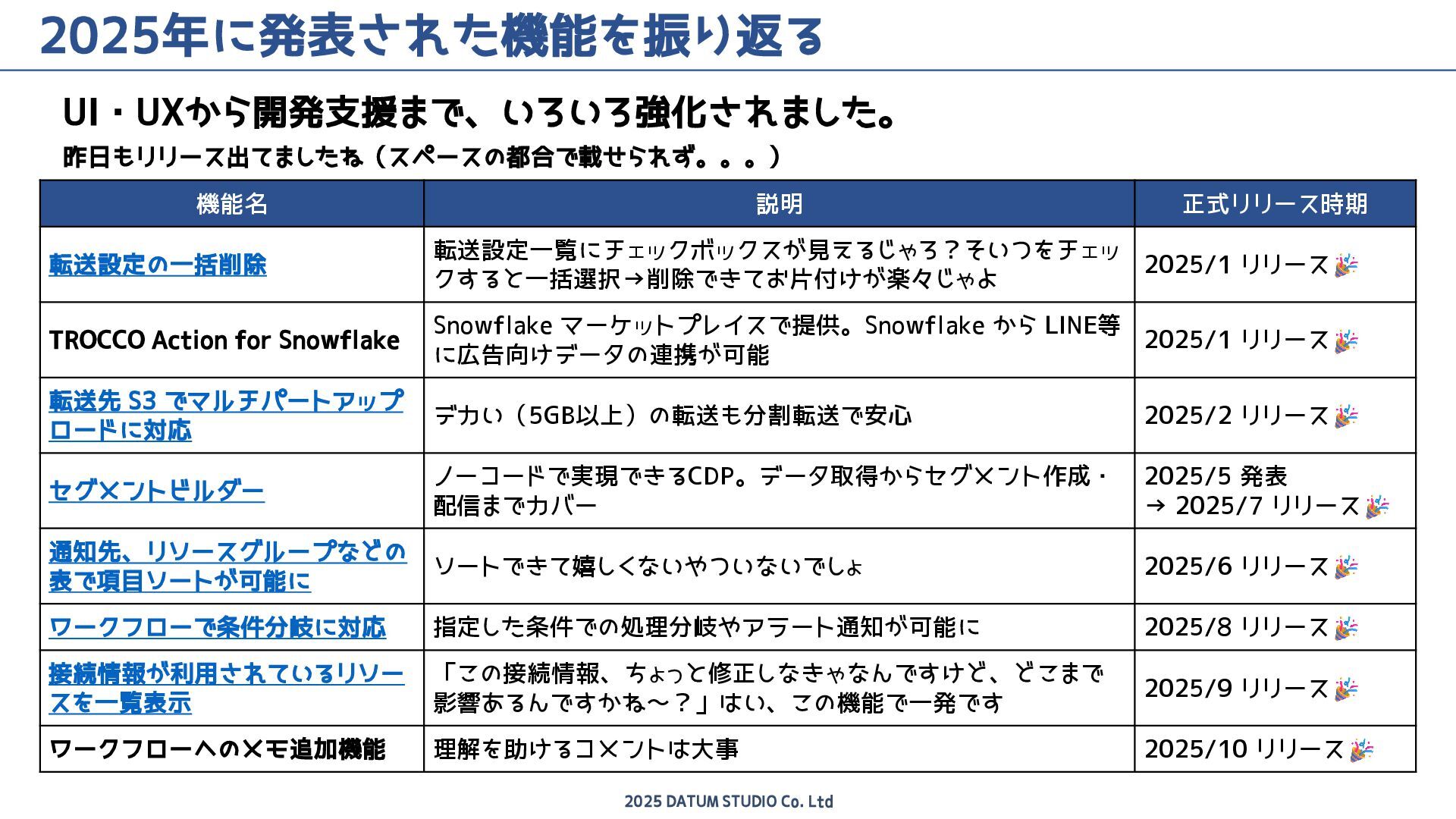クすると一括選択→削除できてお片付けが楽々じゃよ 2025/1 リリース TROCCO Action for Snowflake Snowflake マーケットプレイスで提供。Snowflake から LINE等 に広告向けデータの連携が可能 2025/1 リリース 転送先 S3 でマルチパートアップ ロードに対応 デカい(5GB以上)の転送も分割転送で安心 2025/2 リリース セグメントビルダー ノーコードで実現できるCDP。データ取得からセグメント作成・ 配信までカバー 2025/5 発表 → 2025/7 リリース 通知先、リソースグループなどの 表で項目ソートが可能に ソートできて嬉しくないやついないでしょ 2025/6 リリース ワークフローで条件分岐に対応 指定した条件での処理分岐やアラート通知が可能に 2025/8 リリース 接続情報が利用されているリソー スを一覧表示 「この接続情報、ちょっと修正しなきゃなんですけど、どこまで 影響あるんですかね~?」はい、この機能で一発です 2025/9 リリース ワークフローへのメモ追加機能 理解を助けるコメントは大事 2025/10 リリース 2025年に発表された機能を振り返る UI・UXから開発支援まで、いろいろ強化されました。 昨日もリリース出てましたね(スペースの都合で載せられず。。。)