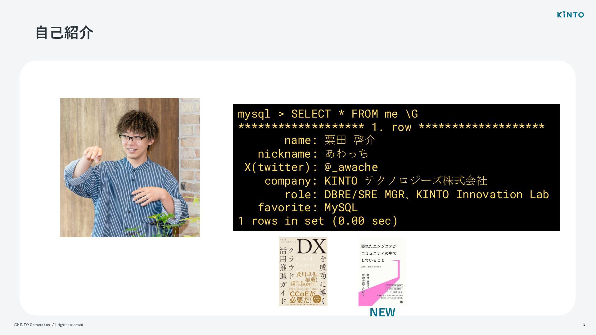 * FROM me \G ******************* 1. row ******************* name: 粟田 啓介 nickname: あわっち X(twitter): @_awache company: KINTO テクノロジーズ株式会社 role: DBRE/SRE MGR、KINTO Innovation Lab favorite: MySQL 1 rows in set (0.00 sec) NEW