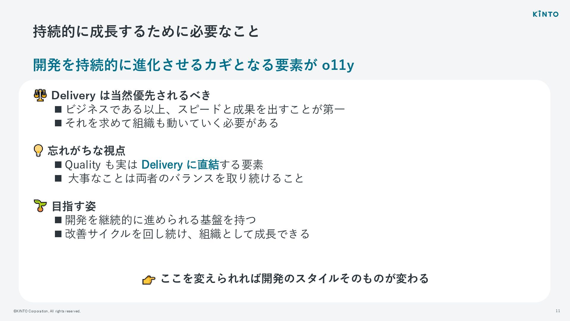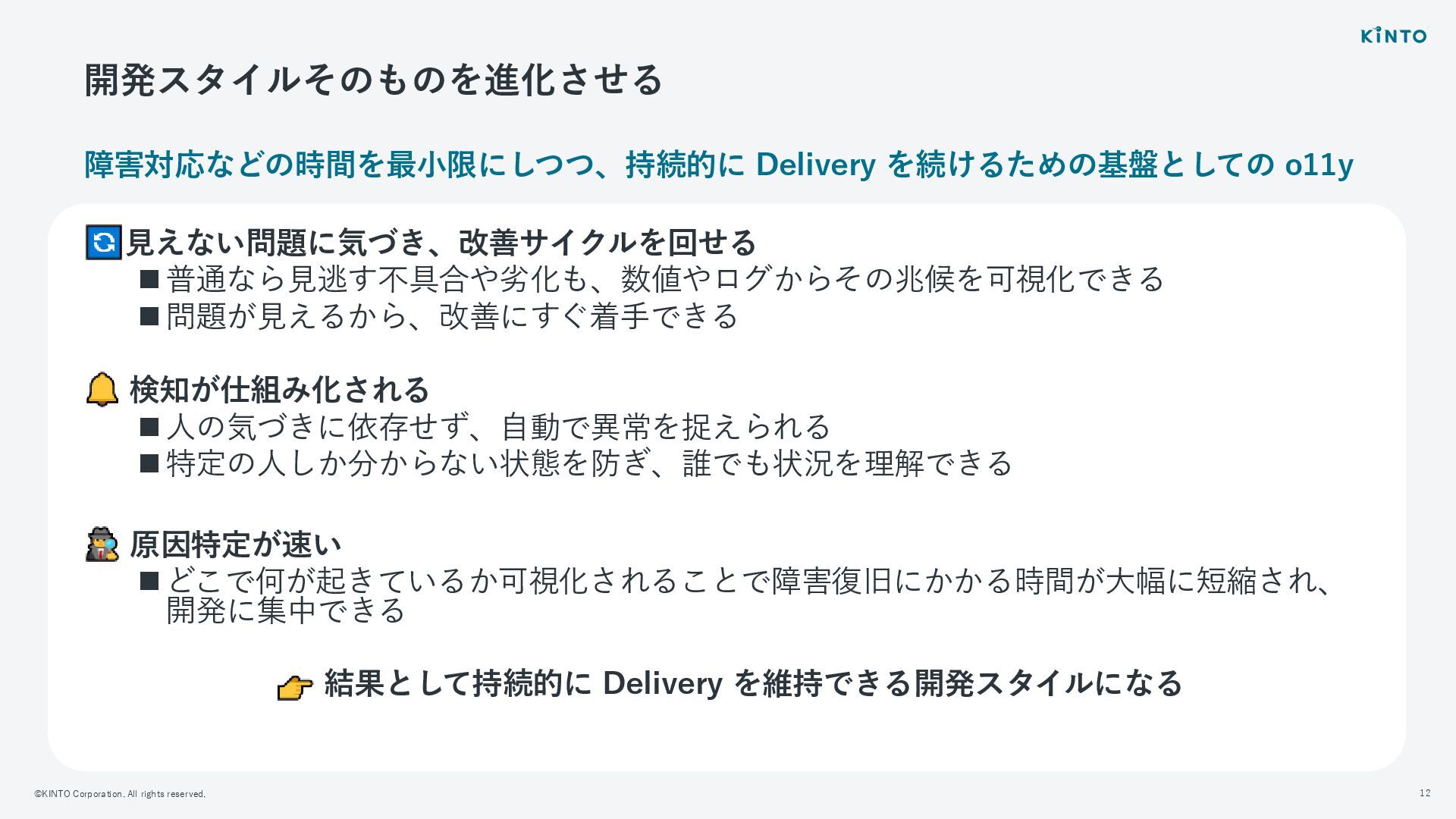 ©KINTO Corporation. All rights reserved. 11 持続的に成長するために必要なこと 開発を持続的に進化させるカギとなる要素が o11y Delivery