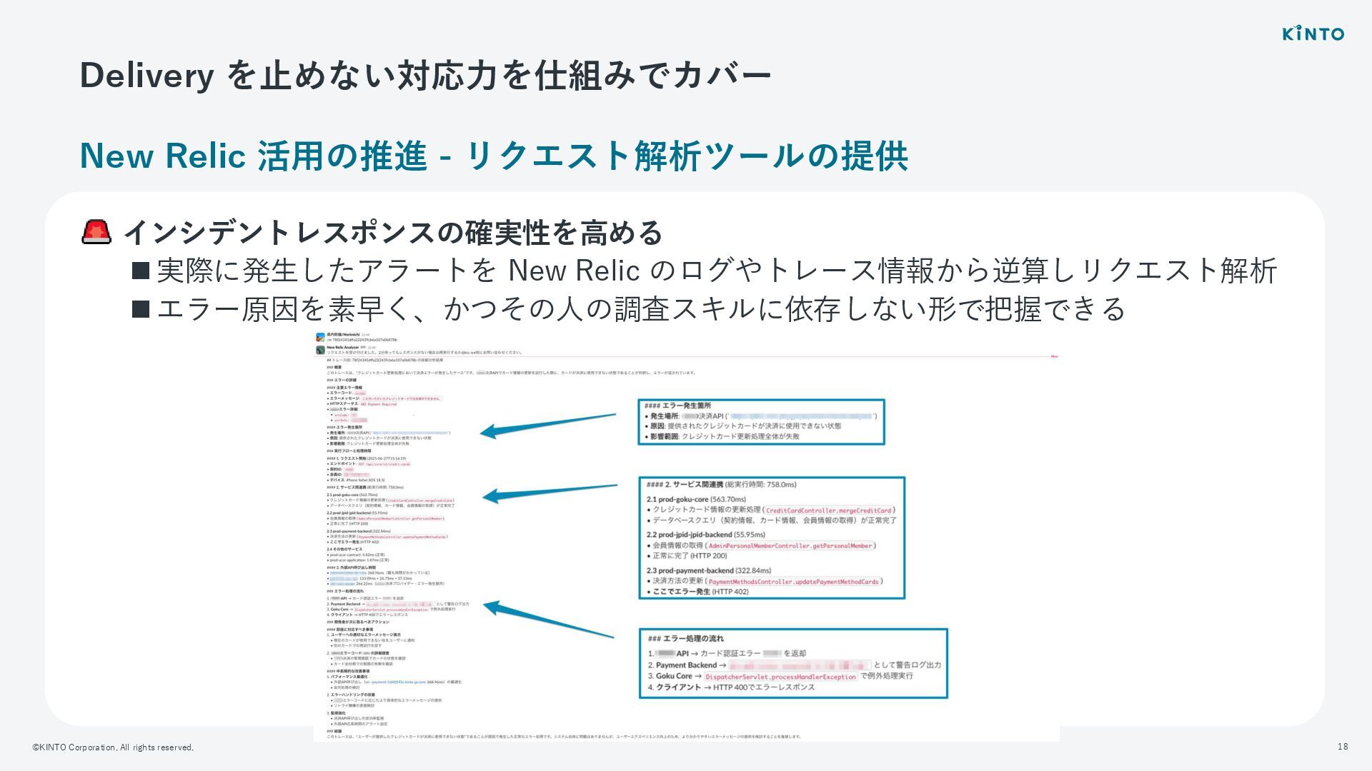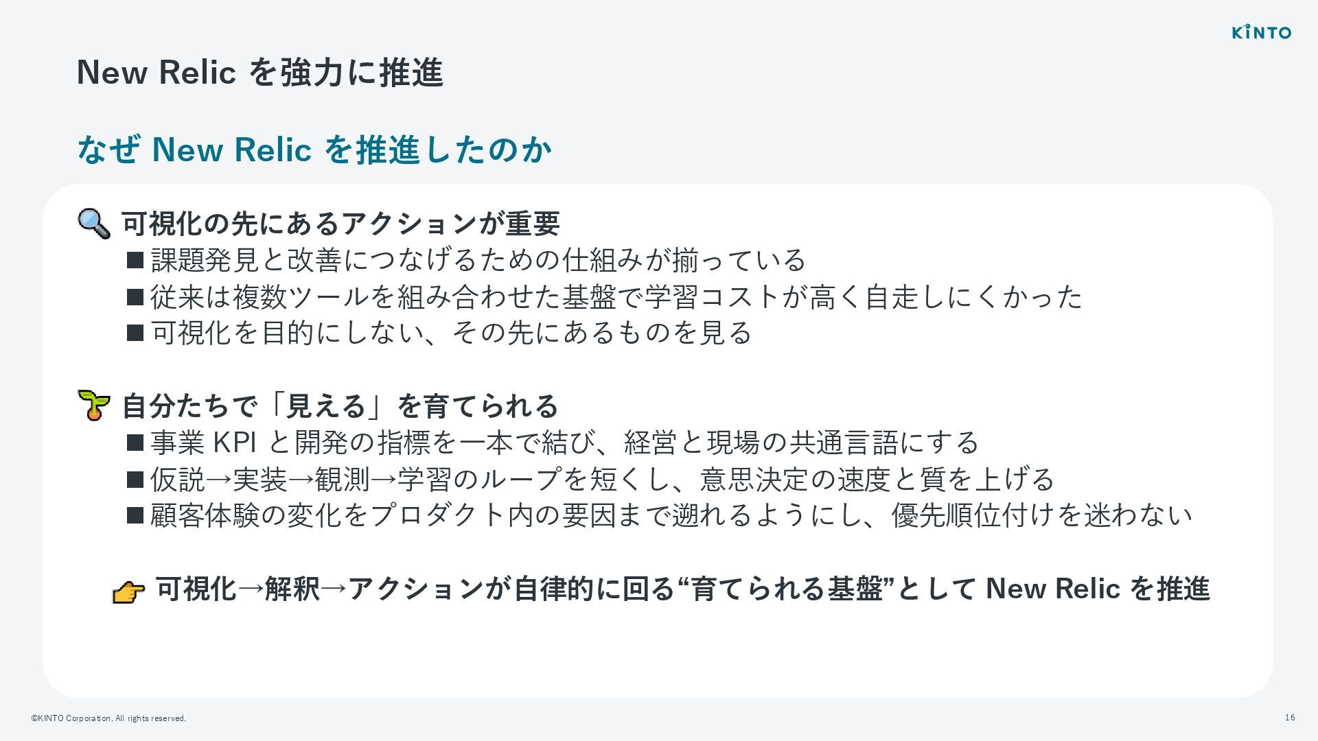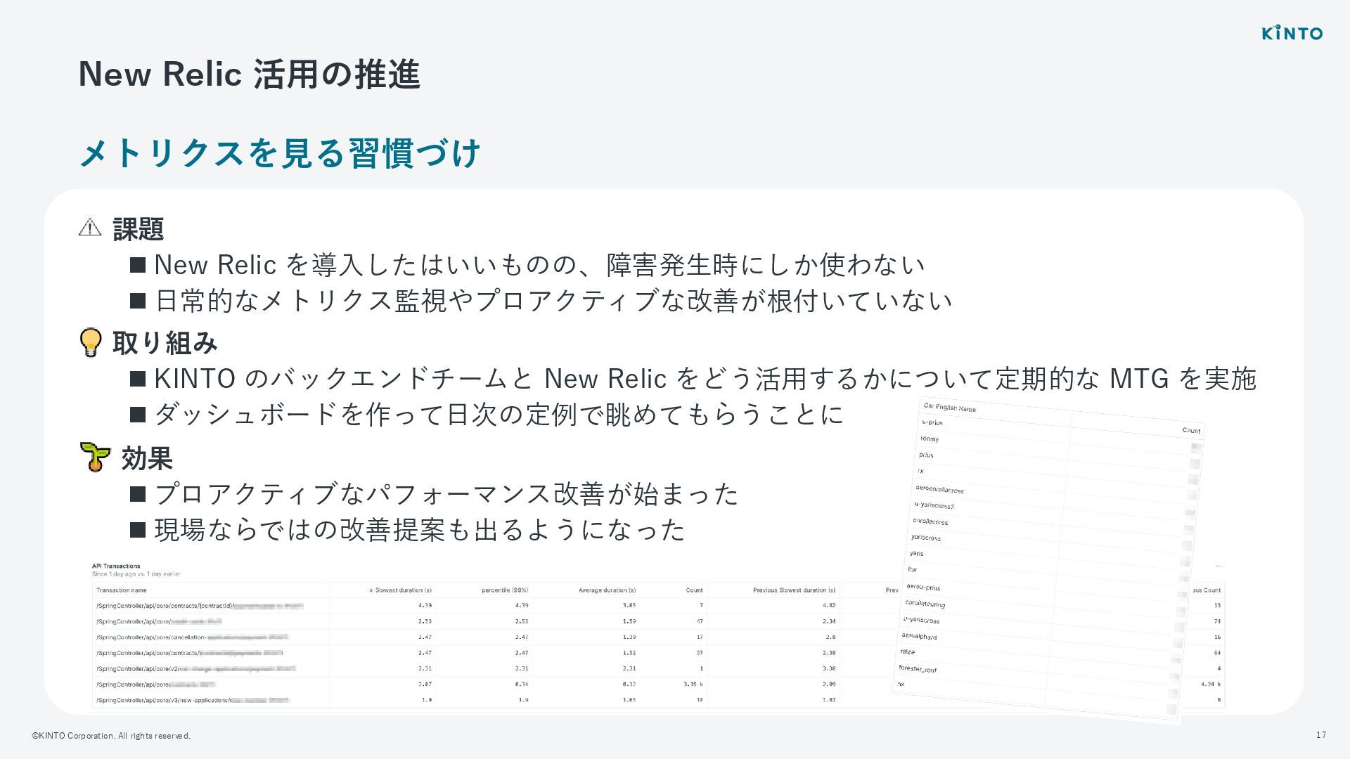 ©KINTO Corporation. All rights reserved. 16 New Relic を強力に推進 可視化の先にあるアクションが重要