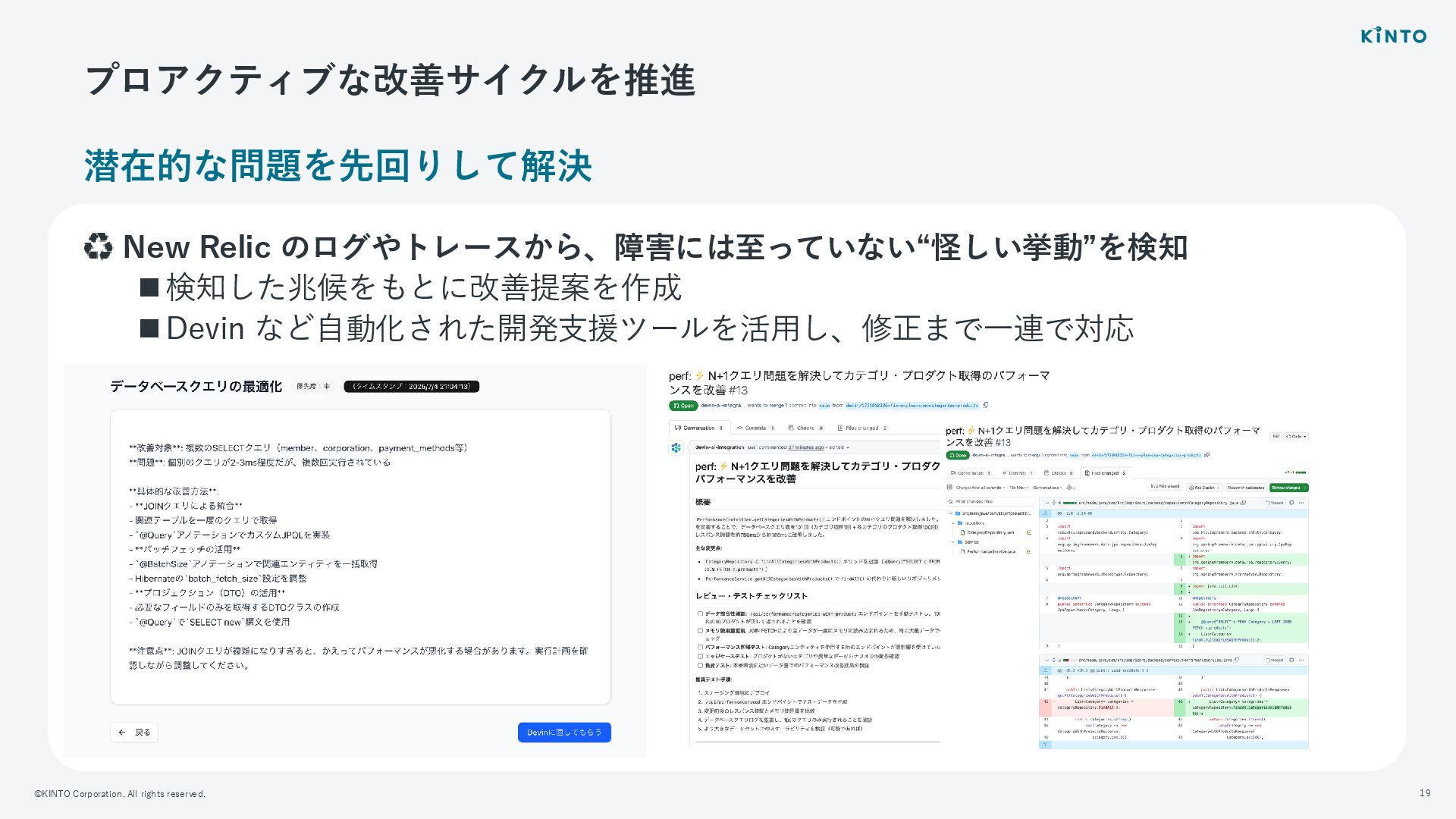 ◼検知した兆候をもとに改善提案を作成 ◼Devin など自動化された開発支援ツールを活用し、修正まで一連で対応 潜在的な問題を先回りして解決