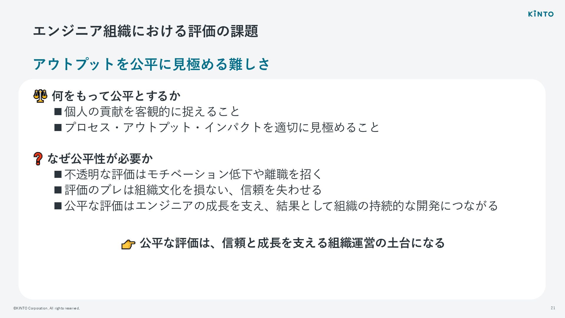 なぜ公平性が必要か ◼不透明な評価はモチベーション低下や離職を招く ◼評価のブレは組織文化を損ない、信頼を失わせる ◼公平な評価はエンジニアの成長を支え、結果として組織の持続的な開発につながる 公平な評価は、信頼と成長を支える組織運営の土台になる アウトプットを公平に見極める難しさ