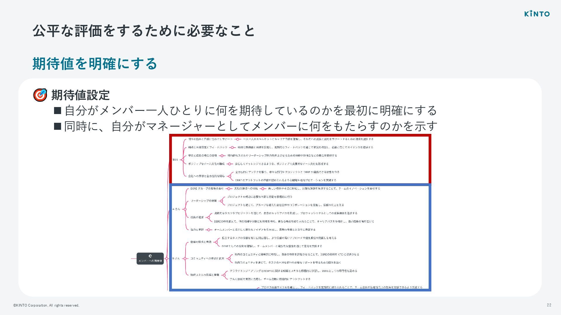 ©KINTO Corporation. All rights reserved. 21 エンジニア組織における評価の課題 何をもって公平とするか ◼個人の貢献を客観的に捉えること ◼プロセス・アウトプット・インパクトを適切に見極めること