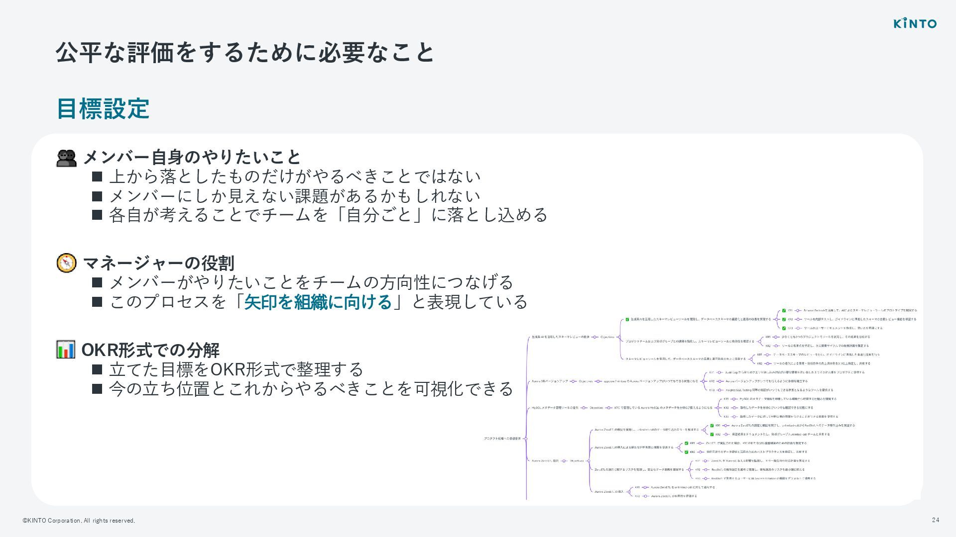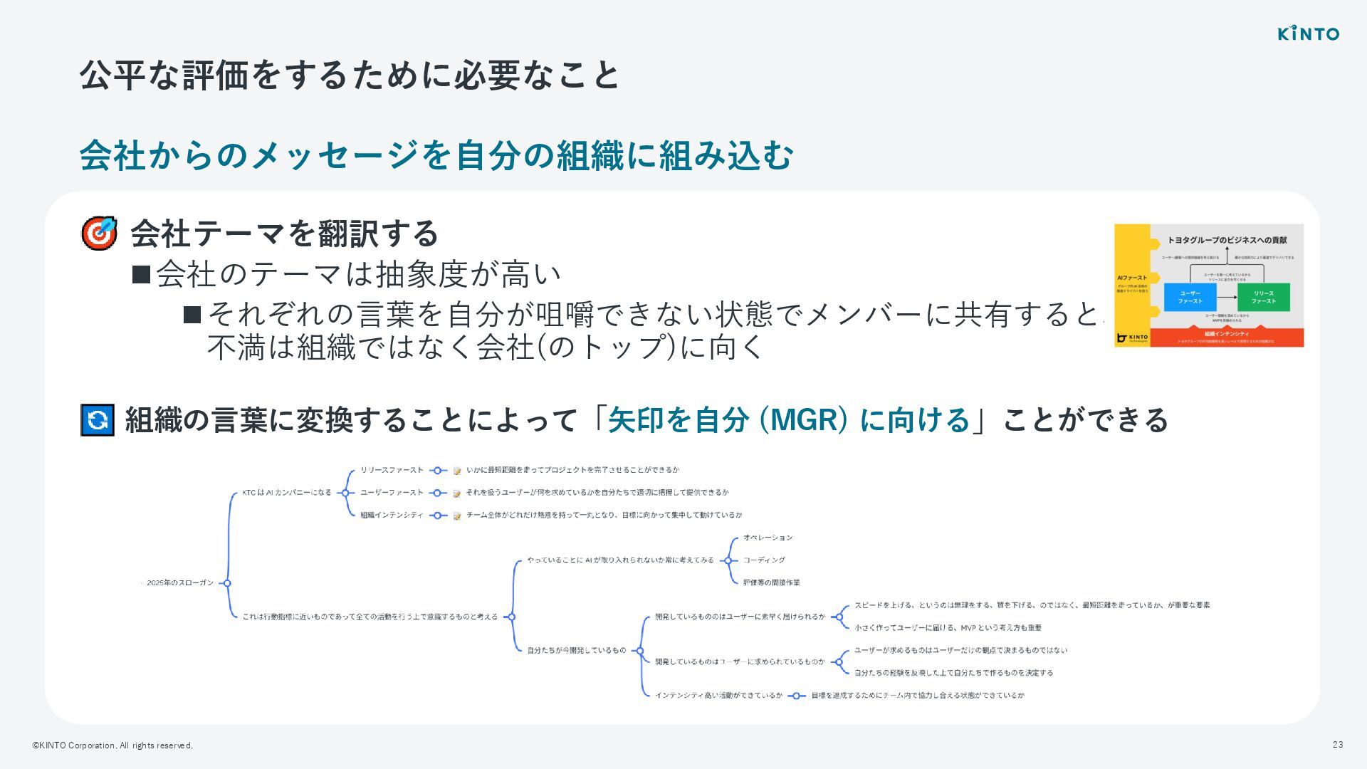 ©KINTO Corporation. All rights reserved. 23 公平な評価をするために必要なこと 会社テーマを翻訳する ◼会社のテーマは抽象度が高い ◼それぞれの言葉を自分が咀嚼できない状態でメンバーに共有すると、