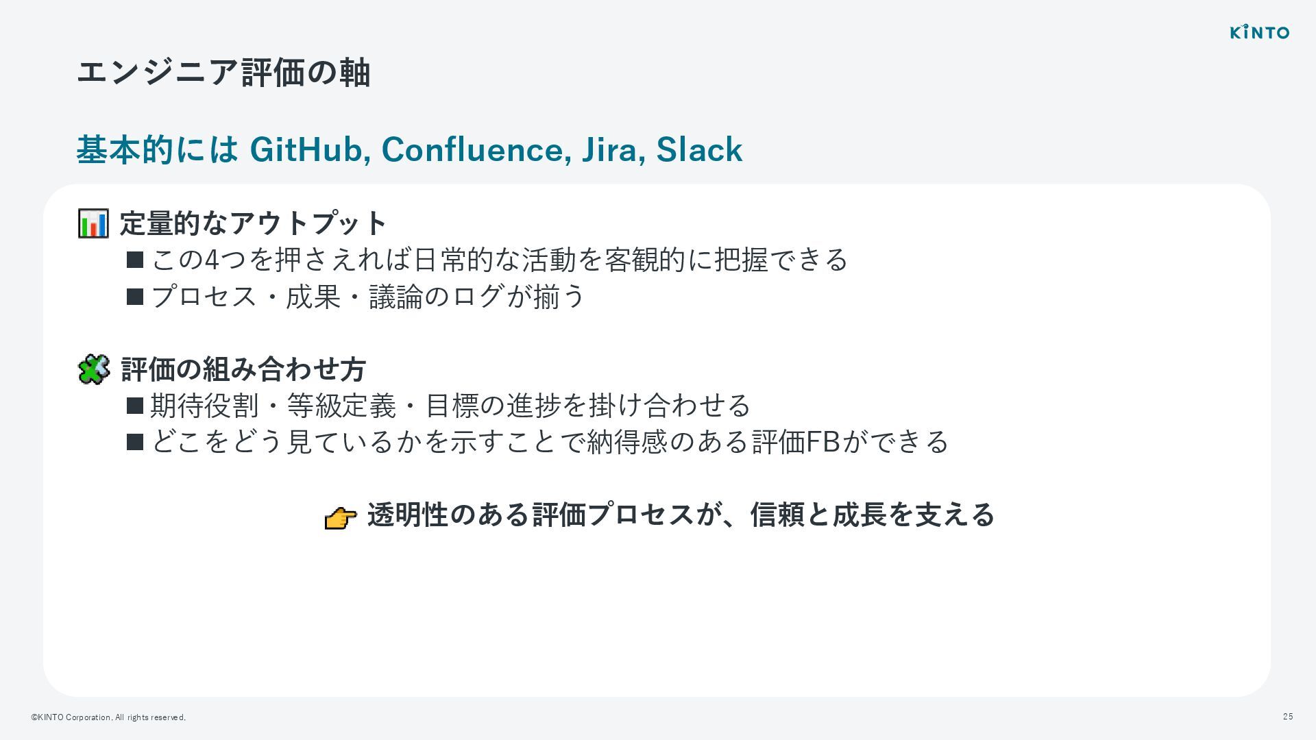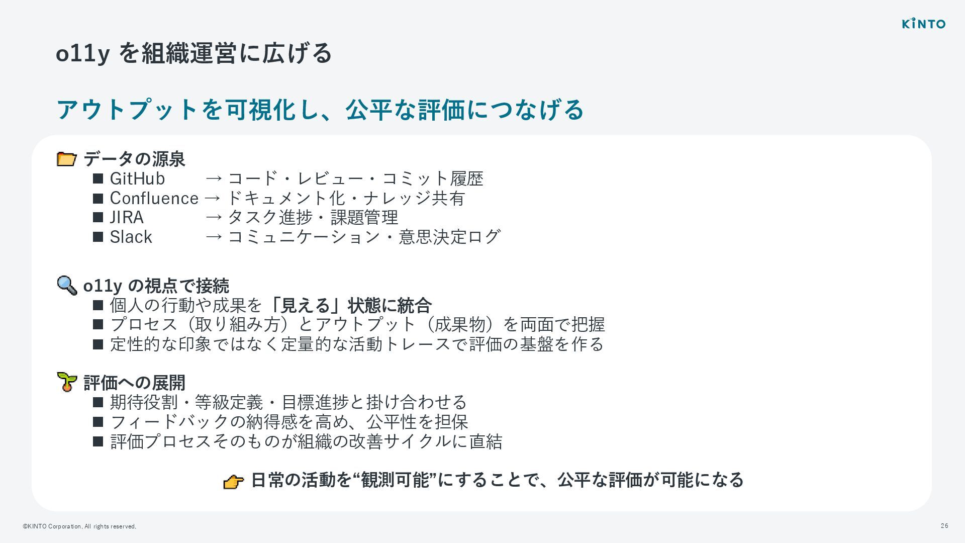 ©KINTO Corporation. All rights reserved. 25 エンジニア評価の軸 定量的なアウトプット ◼この4つを押さえれば日常的な活動を客観的に把握できる ◼プロセス・成果・議論のログが揃う