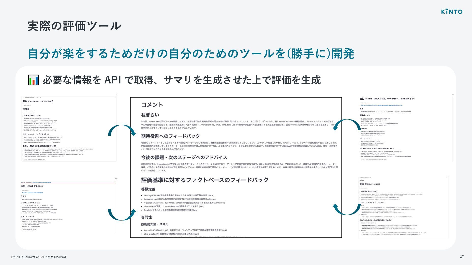 ©KINTO Corporation. All rights reserved. 27 実際の評価ツール 必要な情報を API で取得、サマリを生成させた上で評価を生成