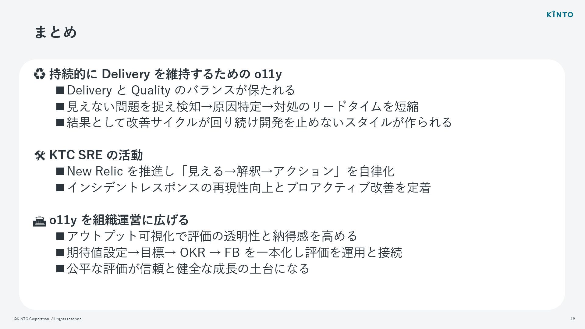 o11y ◼Delivery と Quality のバランスが保たれる ◼見えない問題を捉え検知→原因特定→対処のリードタイムを短縮 ◼結果として改善サイクルが回り続け開発を止めないスタイルが作られる KTC SRE の活動 ◼New Relic を推進し「見える→解釈→アクション」を自律化 ◼インシデントレスポンスの再現性向上とプロアクティブ改善を定着 o11y を組織運営に広げる ◼アウトプット可視化で評価の透明性と納得感を高める ◼期待値設定→目標→ OKR → FB を一本化し評価を運用と接続 ◼公平な評価が信頼と健全な成長の土台になる