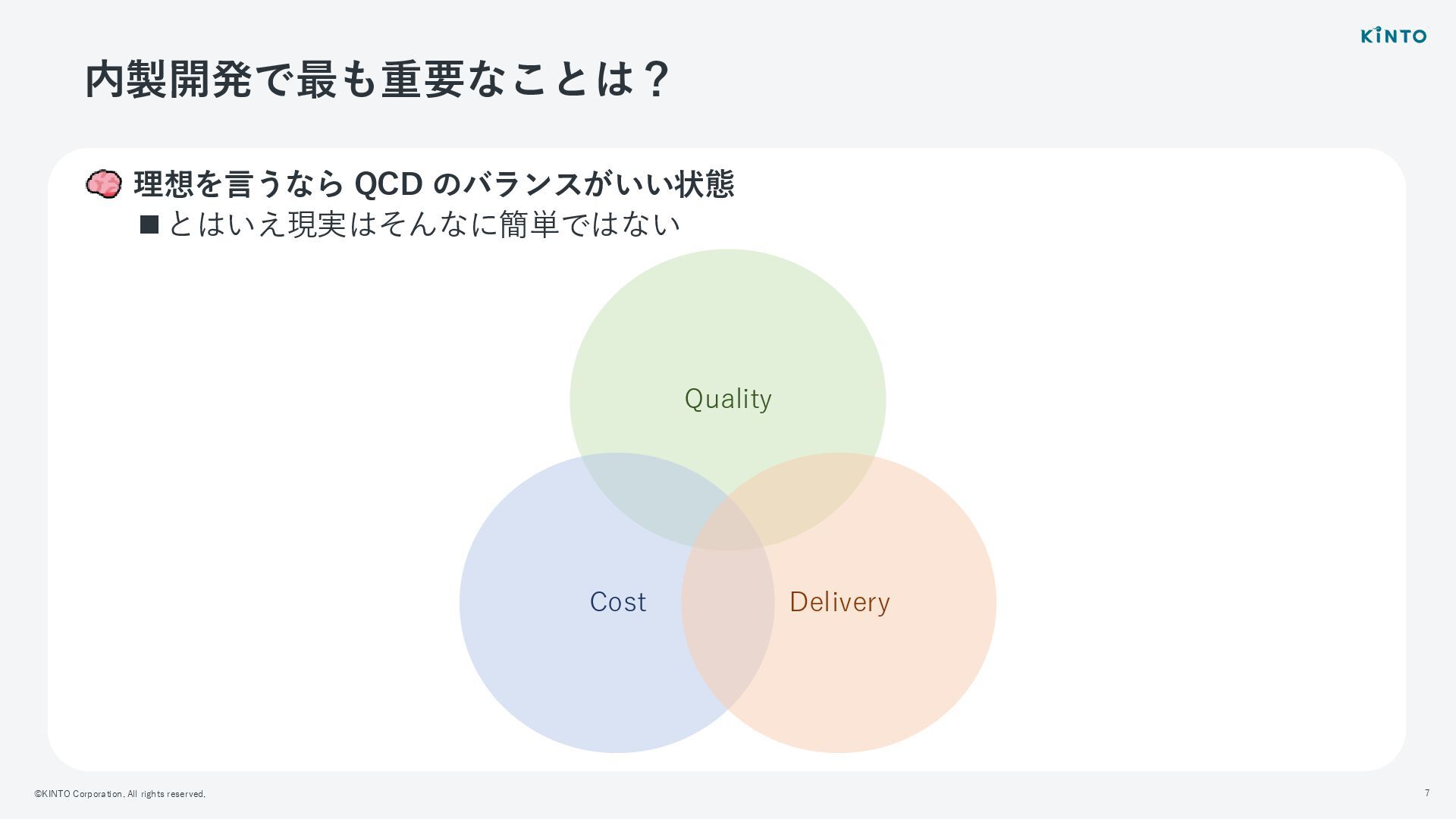 ©KINTO Corporation. All rights reserved. 7 内製開発で最も重要なことは? 理想を言うなら QCD のバランスがいい状態