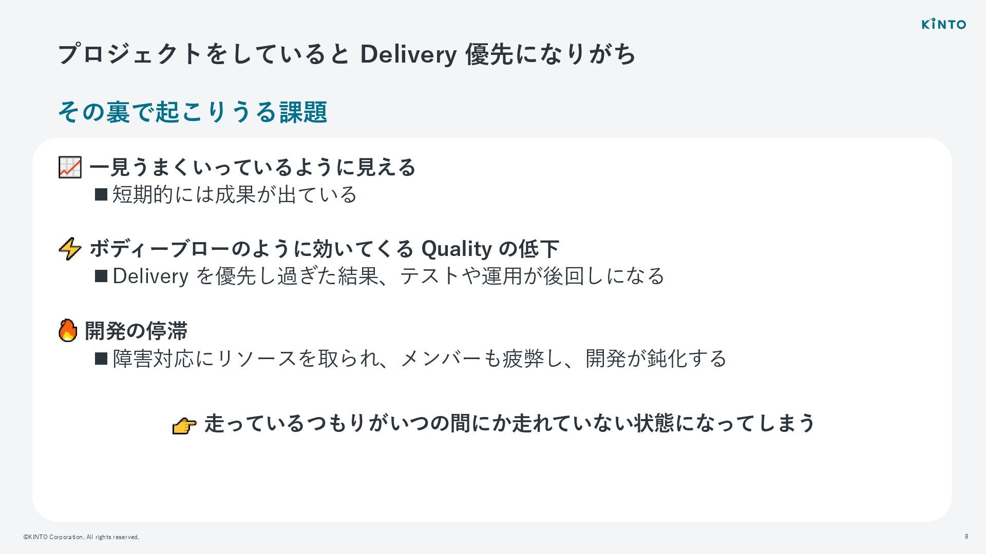 ©KINTO Corporation. All rights reserved. 8 プロジェクトをしていると Delivery 優先になりがち 一見うまくいっているように見える