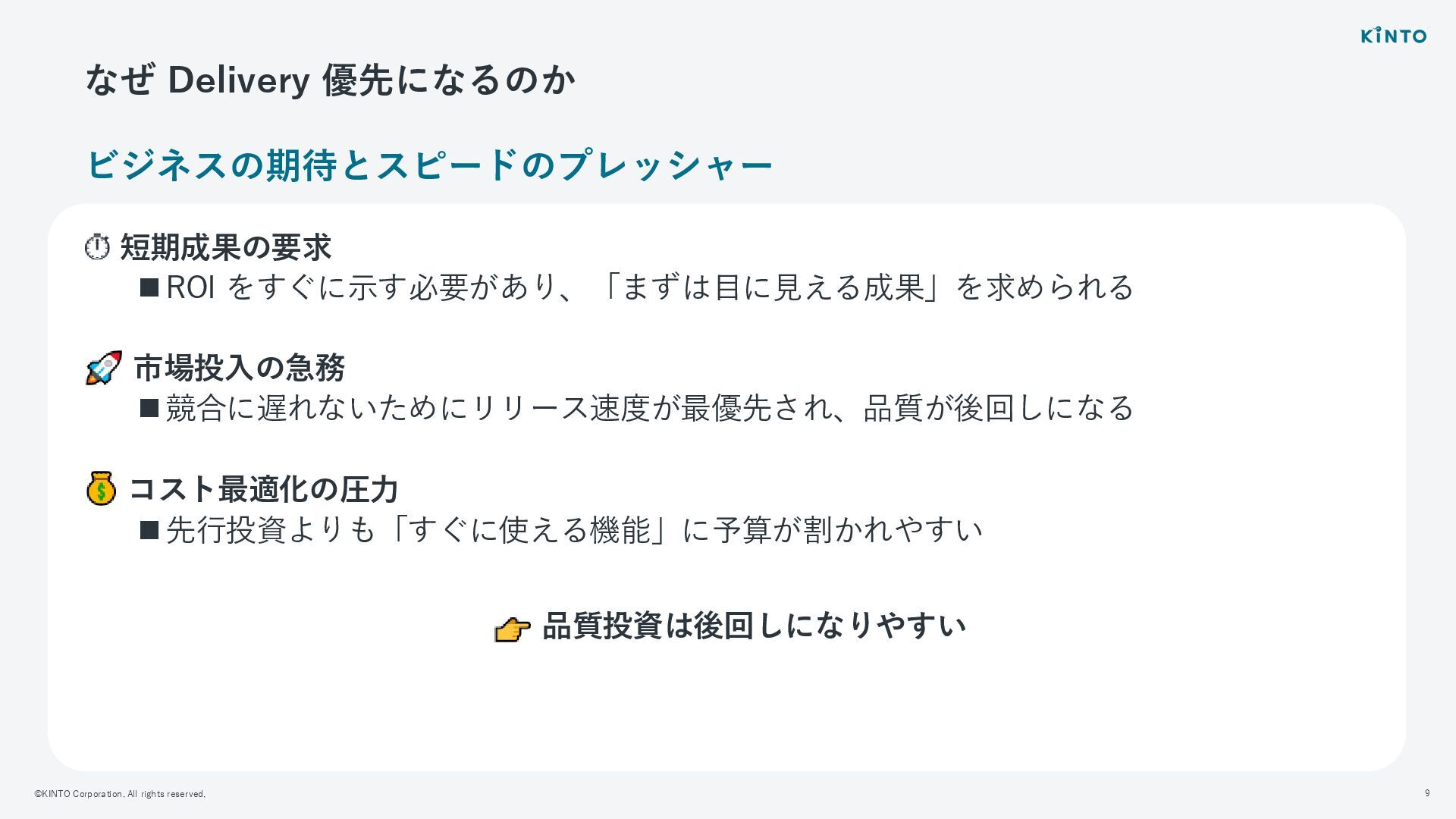 ©KINTO Corporation. All rights reserved. 9 なぜ Delivery 優先になるのか 短期成果の要求