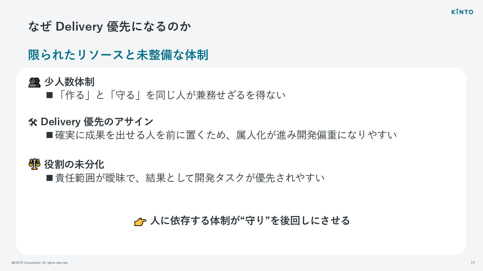 ©KINTO Corporation. All rights reserved. 10 なぜ Delivery 優先になるのか 少人数体制