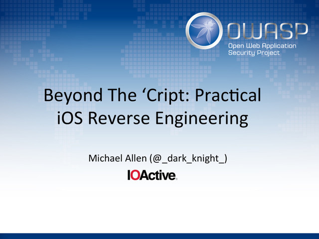 interac4ng with tasks • task_for_pid, processor_set_tasks • Inter Process Communica4on(IPC) – Mach Ports, Mach Messages, XPC • ARM Assembly (32/64) • Behind the scenes with Objec4ve-C and SWIFT • Lot more details but limited 4me see full talk here – h"ps://www.youtube.com/watch?v=4WHEQA3GG9k&feature=youtu.be – h"ps://speakerdeck.com/_dark_knight_/beyond-the-cript-pracIcal-ios-reverse- engineering