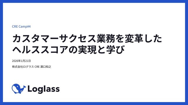 カスタマーサクセス業務を変⾰した ヘルススコアの実現と学び CRE Camp#4 2026年1⽉21⽇ 株式会社ログラス CRE 濵⼝知之 1