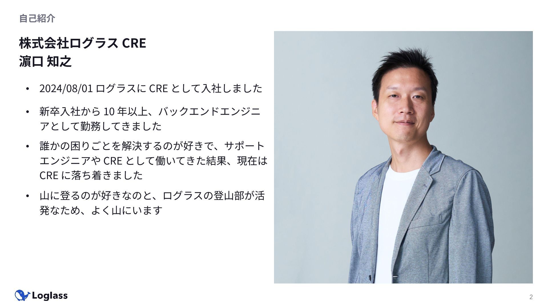 として⼊社しました • 新卒⼊社から 10 年以上、バックエンドエンジニ アとして勤務してきました • 誰かの困りごとを解決するのが好きで、サポート エンジニアや CRE として働いてきた結果、現在は CRE に落ち着きました • ⼭に登るのが好きなのと、ログラスの登⼭部が活 発なため、よく⼭にいます