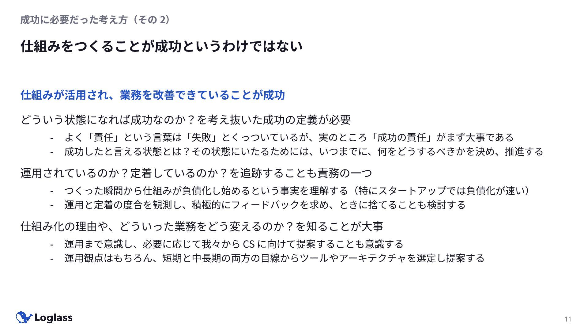 運⽤されているのか?定着しているのか?を追跡することも責務の⼀つ - つくった瞬間から仕組みが負債化し始めるという事実を理解する(特にスタートアップでは負債化が速い) - 運⽤と定着の度合を観測し、積極的にフィードバックを求め、ときに捨てることも検討する 仕組み化の理由や、どういった業務をどう変えるのか?を知ることが⼤事 - 運⽤まで意識し、必要に応じて我々から CS に向けて提案することも意識する - 運⽤観点はもちろん、短期と中⻑期の両⽅の⽬線からツールやアーキテクチャを選定し提案する