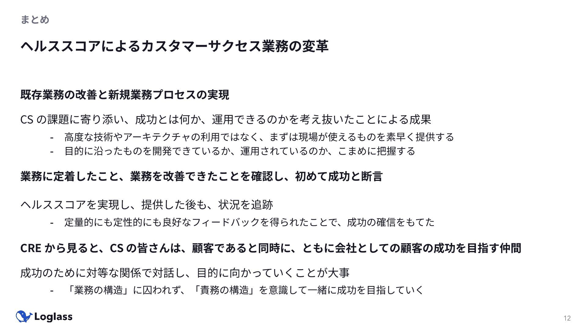 ヘルススコアを実現し、提供した後も、状況を追跡 - 定量的にも定性的にも良好なフィードバックを得られたことで、成功の確信をもてた 業務に定着したこと、業務を改善できたことを確認し、初めて成功と断⾔ CRE から⾒ると、CS の皆さんは、顧客であると同時に、ともに会社としての顧客の成功を⽬指す仲間 成功のために対等な関係で対話し、⽬的に向かっていくことが⼤事 - 「業務の構造」に囚われず、「責務の構造」を意識して⼀緒に成功を⽬指していく