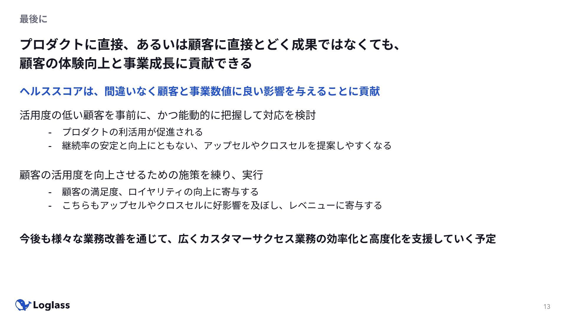 まとめ ヘルススコアによるカスタマーサクセス業務の変⾰ 12 既存業務の改善と新規業務プロセスの実現 CS の課題に寄り添い、成功とは何か、運⽤できるのかを考え抜いたことによる成果 - ⾼度な技術やアーキテクチャの利⽤ではなく、まずは現場が使えるものを素早く提供する - ⽬的に沿ったものを開発できているか、運⽤されているのか、こまめに把握する
