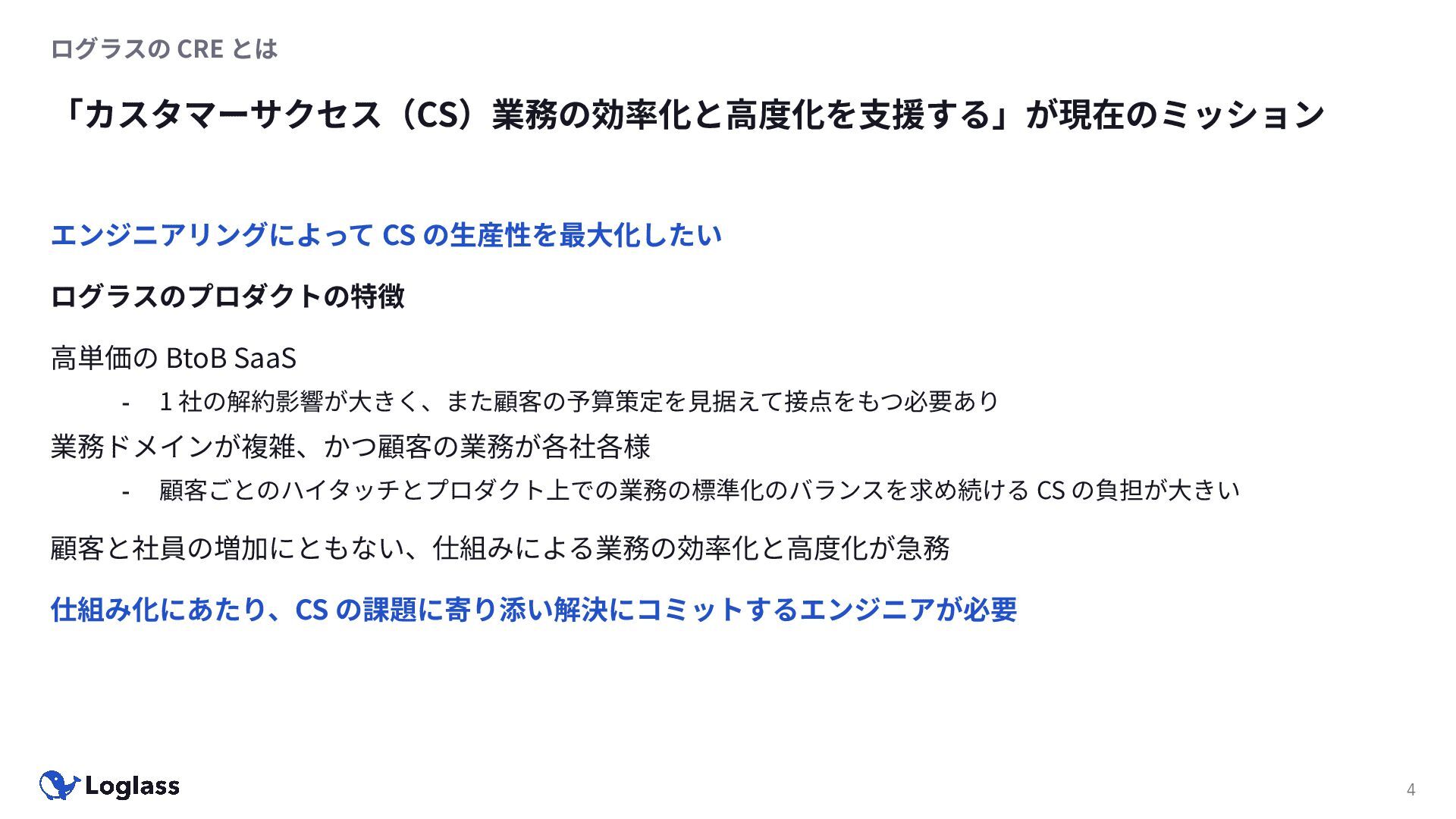 ログラスの CRE とは 「カスタマーサクセス(CS)業務の効率化と⾼度化を⽀援する」が現在のミッション 4 エンジニアリングによって CS の⽣産性を最⼤化したい ログラスのプロダクトの特徴 ⾼単価の
