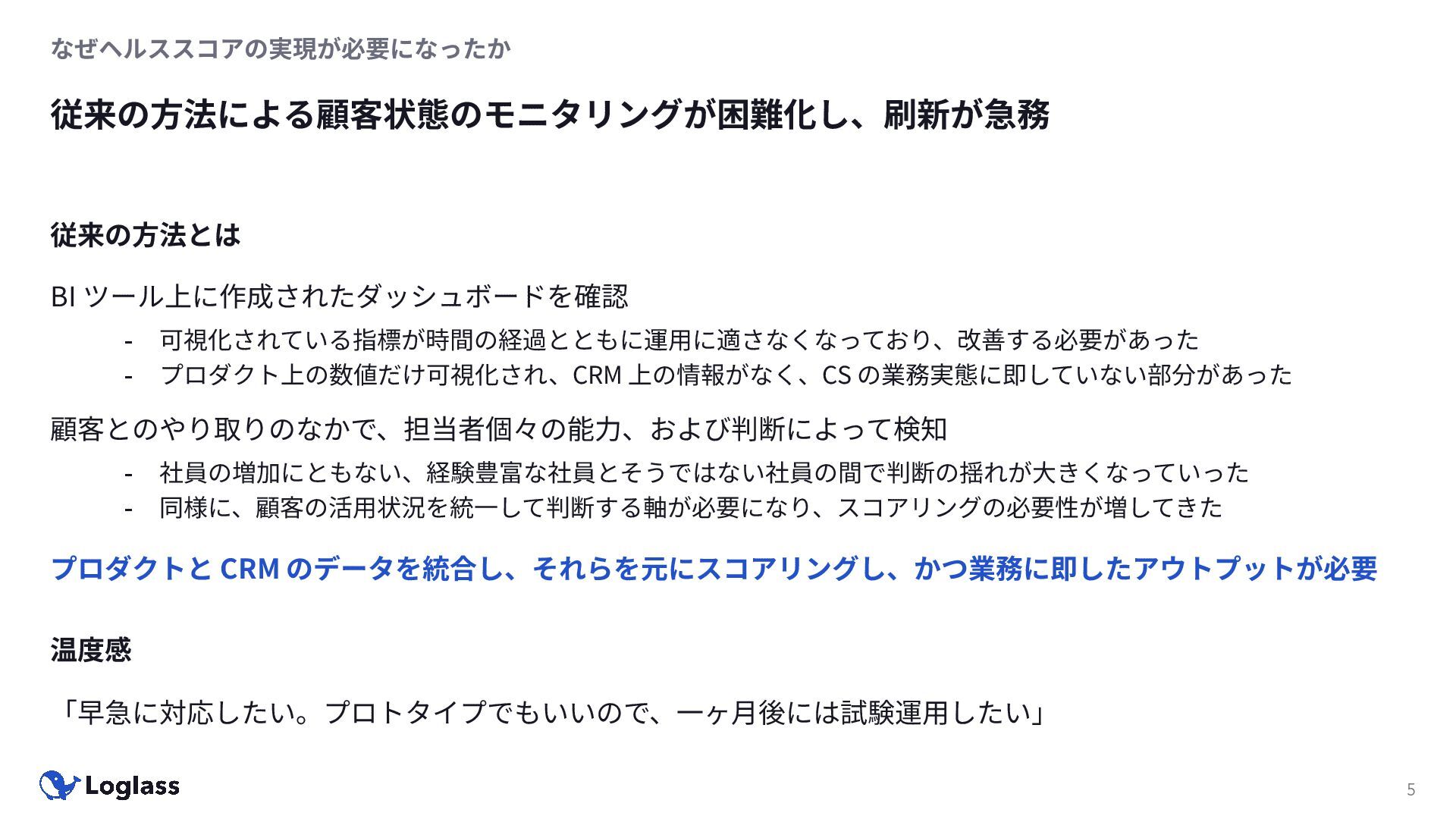 上の情報がなく、CS の業務実態に即していない部分があった 「早急に対応したい。プロトタイプでもいいので、⼀ヶ⽉後には試験運⽤したい」 温度感 顧客とのやり取りのなかで、担当者個々の能⼒、および判断によって検知 - 社員の増加にともない、経験豊富な社員とそうではない社員の間で判断の揺れが⼤きくなっていった - 同様に、顧客の活⽤状況を統⼀して判断する軸が必要になり、スコアリングの必要性が増してきた プロダクトと CRM のデータを統合し、それらを元にスコアリングし、かつ業務に即したアウトプットが必要