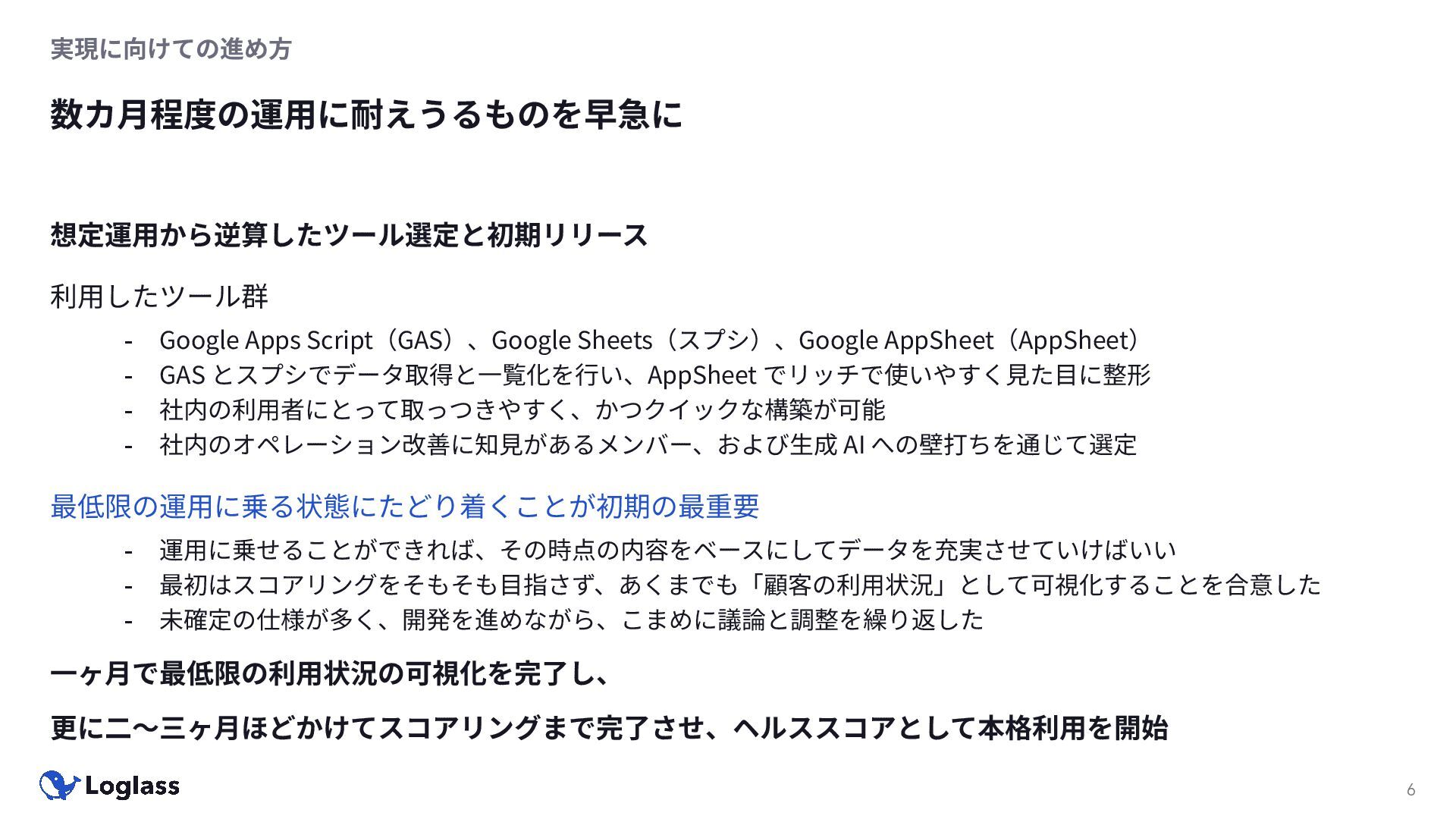 AppSheet(AppSheet) - GAS とスプシでデータ取得と⼀覧化を⾏い、AppSheet でリッチで使いやすく⾒た⽬に整形 - 社内の利⽤者にとって取っつきやすく、かつクイックな構築が可能 - 社内のオペレーション改善に知⾒があるメンバー、および⽣成 AI への壁打ちを通じて選定 最低限の運⽤に乗る状態にたどり着くことが初期の最重要 - 運⽤に乗せることができれば、その時点の内容をベースにしてデータを充実させていけばいい - 最初はスコアリングをそもそも⽬指さず、あくまでも「顧客の利⽤状況」として可視化することを合意した - 未確定の仕様が多く、開発を進めながら、こまめに議論と調整を繰り返した ⼀ヶ⽉で最低限の利⽤状況の可視化を完了し、 更に⼆〜三ヶ⽉ほどかけてスコアリングまで完了させ、ヘルススコアとして本格利⽤を開始