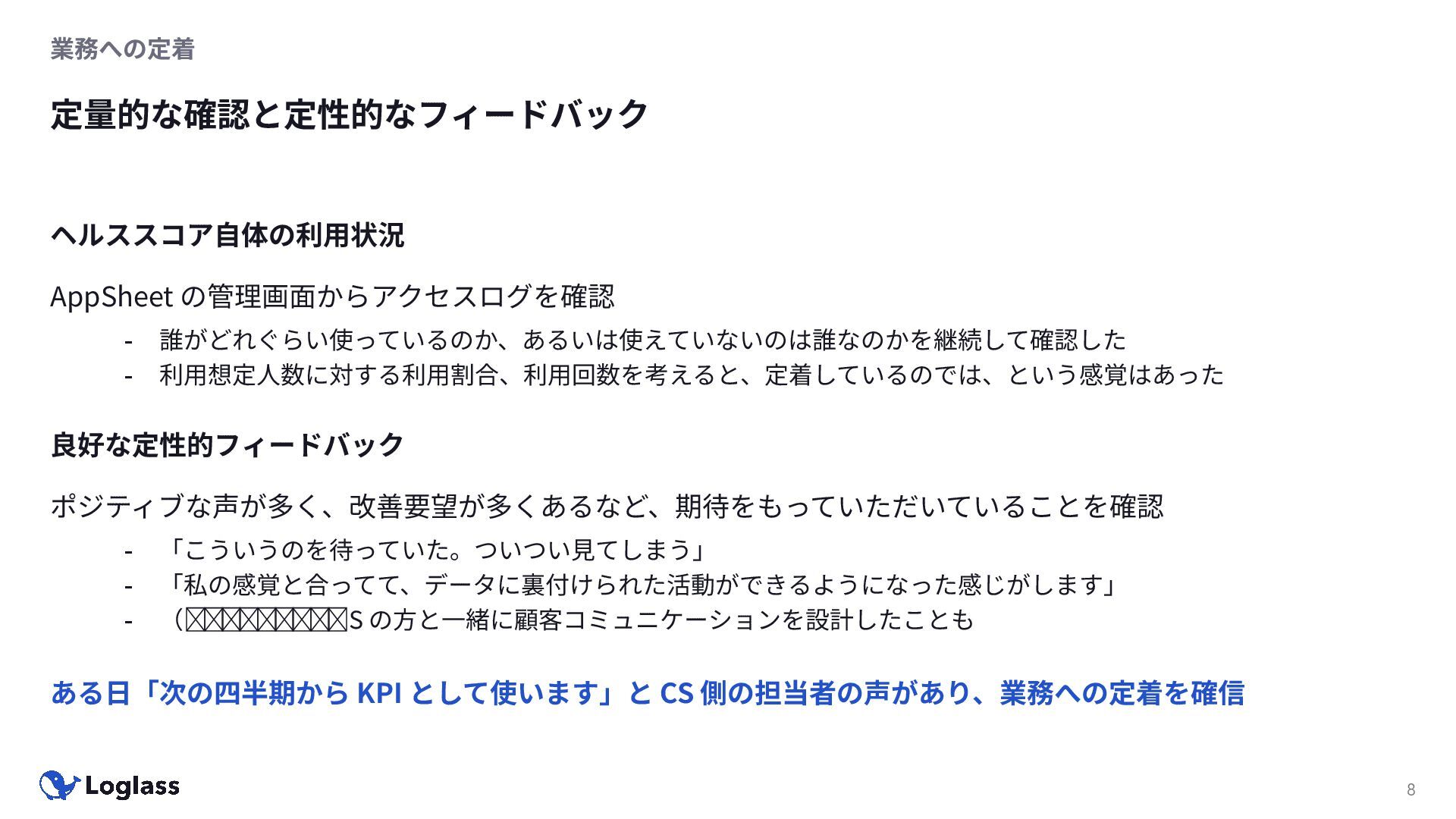 ある⽇「次の四半期から KPI として使います」と CS 側の担当者の声があり、業務への定着を確信 良好な定性的フィードバック ポジティブな声が多く、改善要望が多くあるなど、期待をもっていただいていることを確認 - 「こういうのを待っていた。ついつい⾒てしまう」 - 「私の感覚と合ってて、データに裏付けられた活動ができるようになった感じがします」 - (余談)ヘルススコアを⾒ながら CS の⽅と⼀緒に顧客コミュニケーションを設計したことも