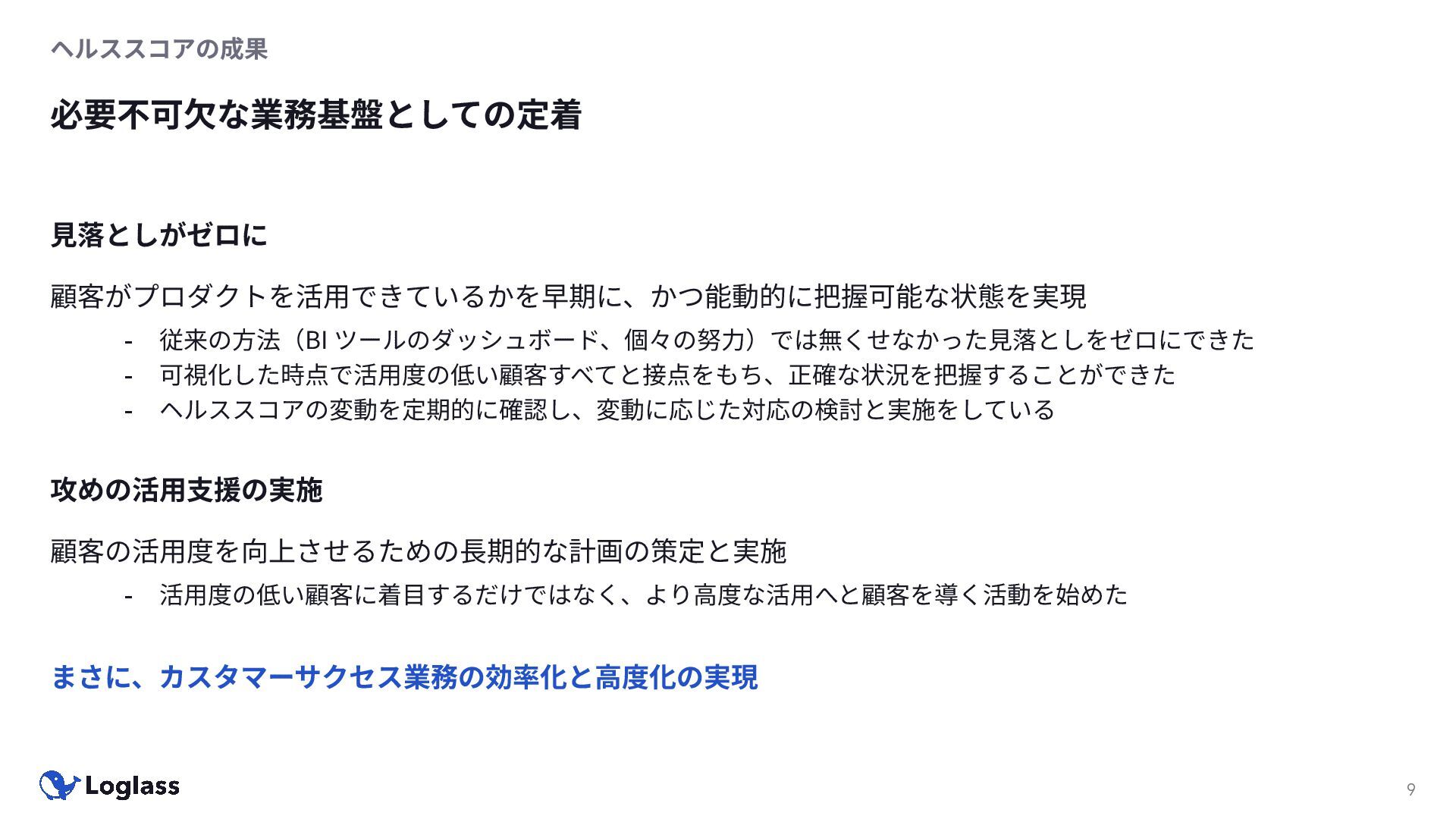 - ヘルススコアの変動を定期的に確認し、変動に応じた対応の検討と実施をしている 攻めの活⽤⽀援の実施 顧客の活⽤度を向上させるための⻑期的な計画の策定と実施 - 活⽤度の低い顧客に着⽬するだけではなく、より⾼度な活⽤へと顧客を導く活動を始めた まさに、カスタマーサクセス業務の効率化と⾼度化の実現
