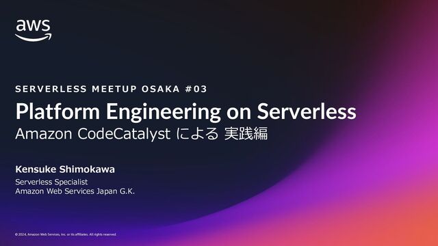 rights reserved. Platform Engineering on Serverless Amazon CodeCatalyst による 実践編 S E R V E R L E SS M E ET U P O S A K A # 0 3 Kensuke Shimokawa Serverless Specialist Amazon Web Services Japan G.K.